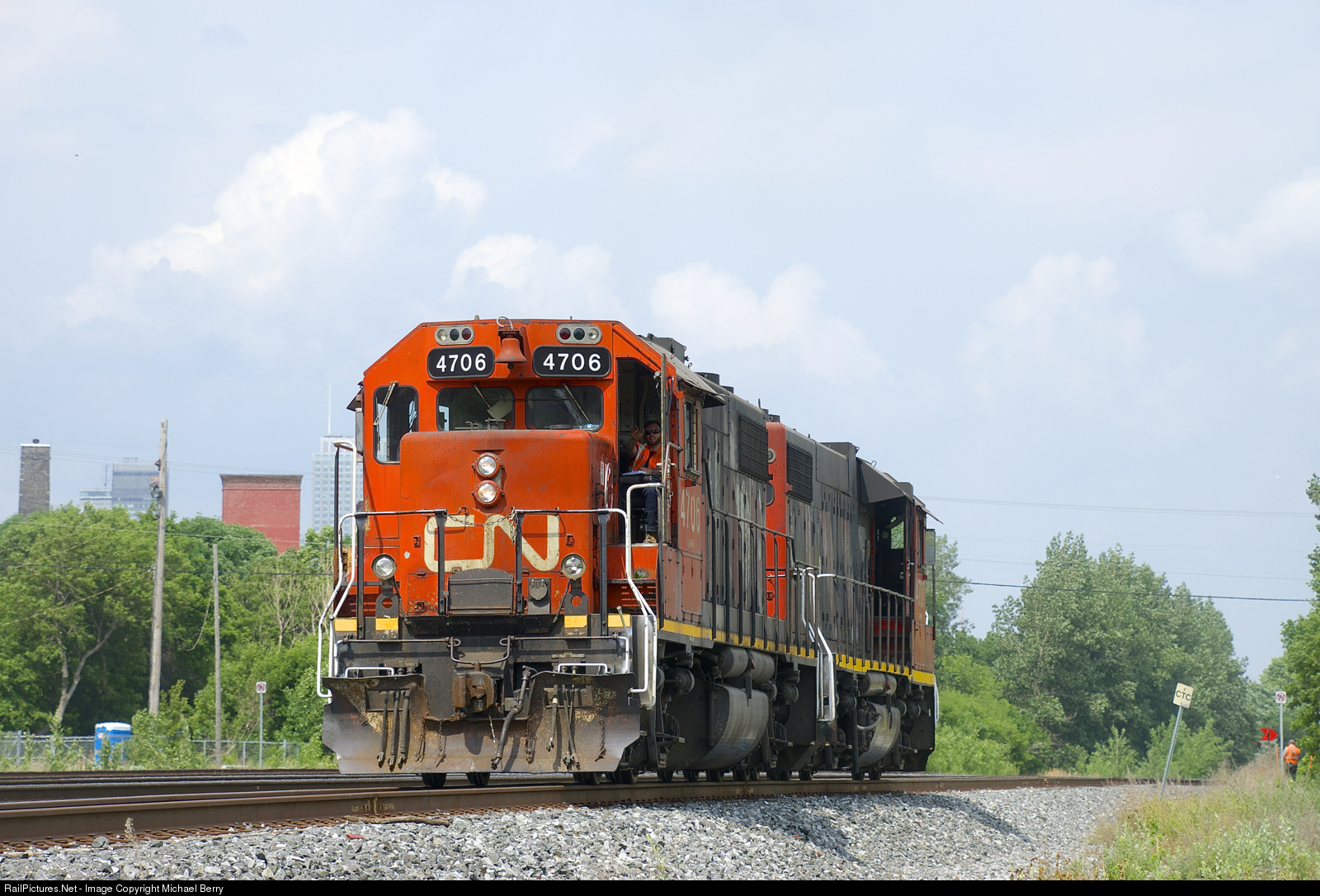 | About to enter CTC territory. After bringing a single boxcar to the Kruger plant, CN 4706 & CN 4707 are leaving the Turcot Holding Spur light power. Having already received permission from the RTC to enter the south track of CN's Montreal Sub at MP 3.85, the power is heading east with the conductor in place to throw the switch once the power has passed him. Note the nice zebra striped plow and a crewmember waving from CN 4706. |
