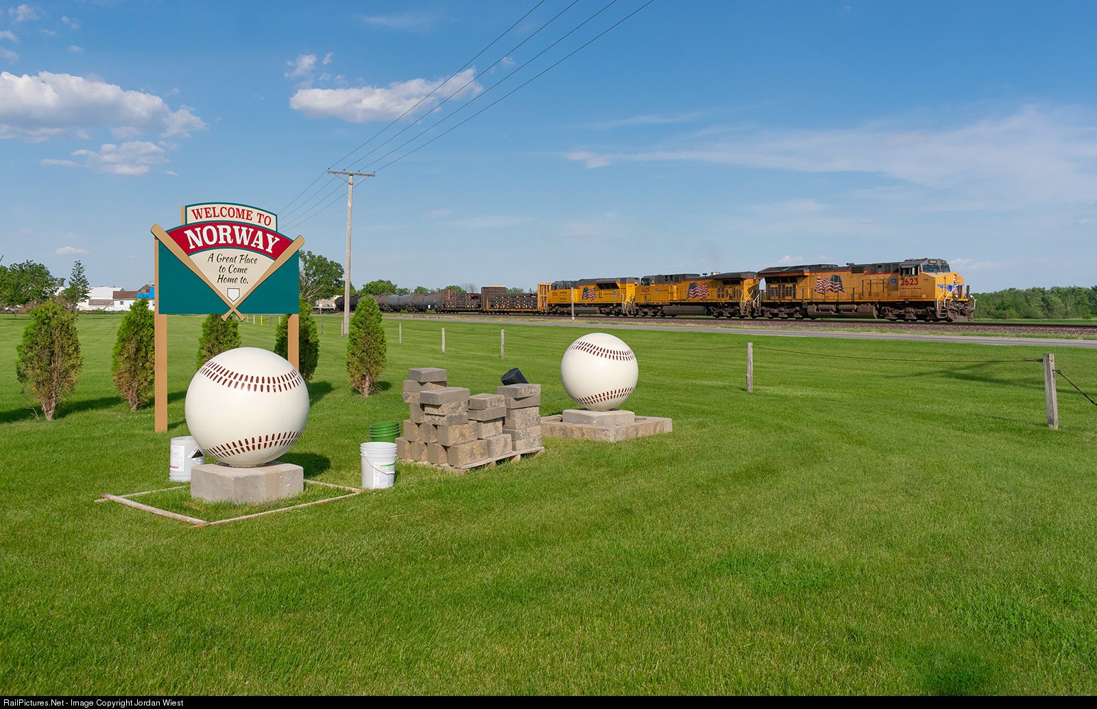 A massive 3x1x1 manifest from Proviso, IL to North Platte, NE heads west through the town of Norway, with a neat welcoming sign still in progress.