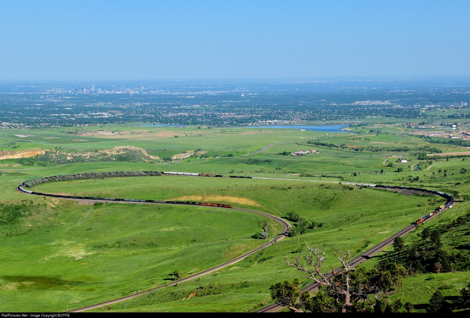 This view takes in the Denver Skyline and the Big Ten Curve as BNSF 7068 (ES44C4) leads a long freight down the Moffat Tunnel Sub at Eisele, Colorado.