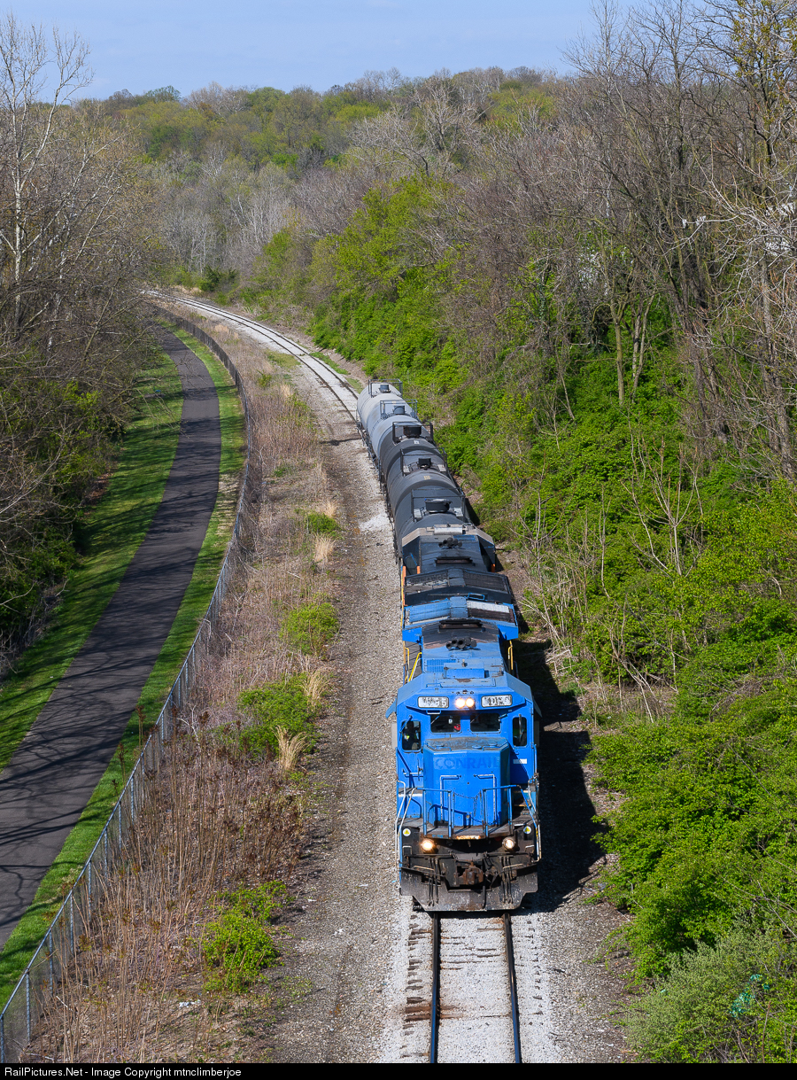 After descending downgrade to river level, the Ohio Central Cambridge Sub follows the banks of the Muskingum River as they head into Zanesville, Ohio. Led by two GE Super 7's, the ZVL makes its return to town with 5 tank cars in tow from Cambridge.