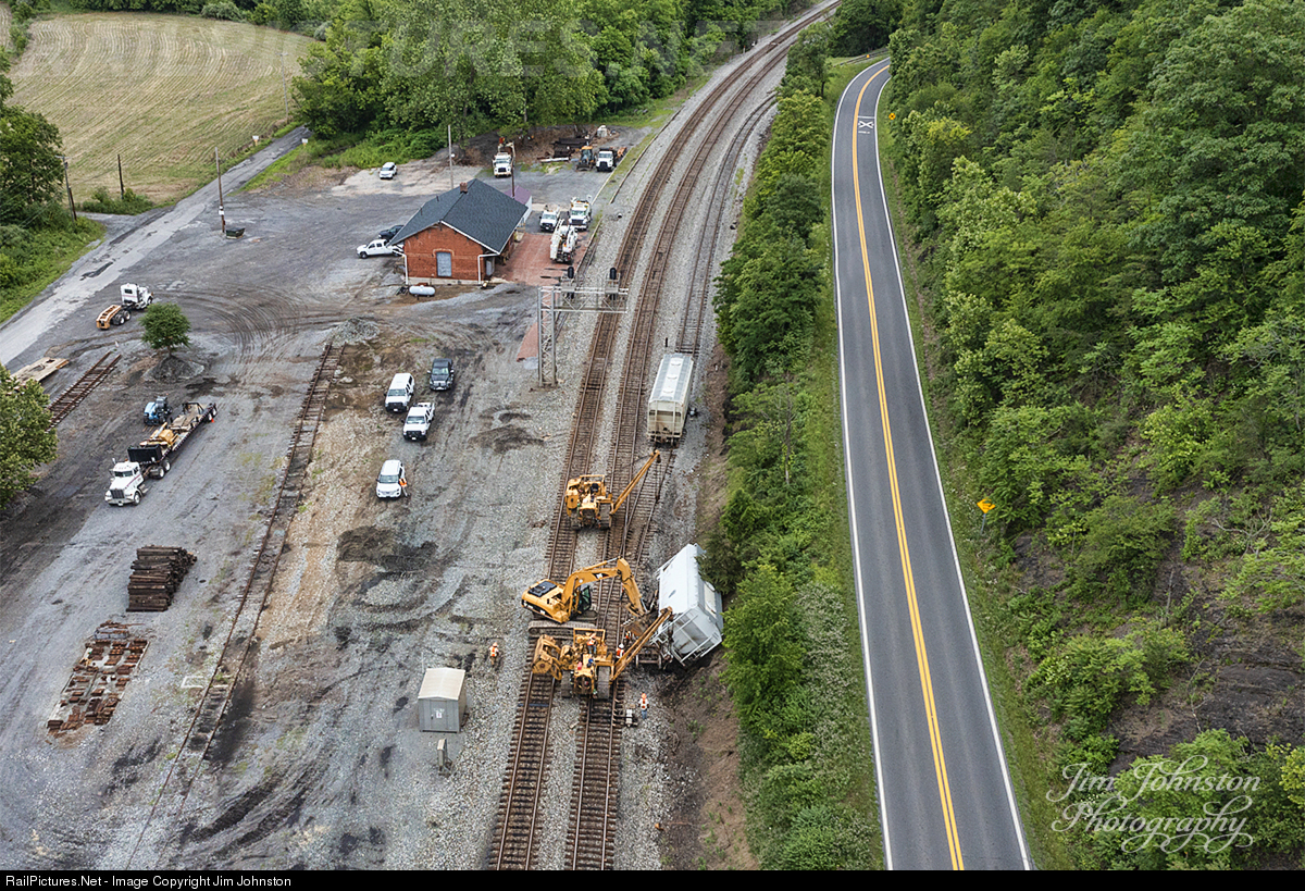 Cranemasters work to clear derailed covered sand hoppers. The hoppers broke free from the U.S. Silica plant in Berkley Springs and travelled down the industrial track (to the right in the picture) before hitting the derail by Hancock yard. The work required traffic on the CSX Cumberland Sub to be stopped for a few hours.