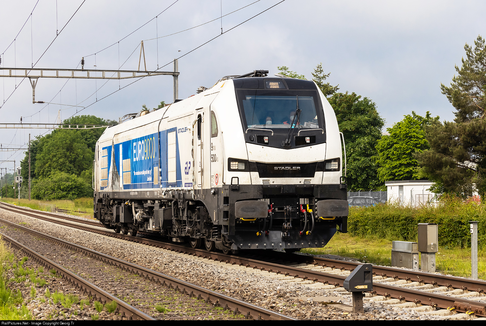 One of the world's most powerful hybrid electric/diesel sixaxle locomotive came to Switzerland for the first time and can be seen on a test run as 97421 from Sulgen to Romanshorn, entering Erlen, running in diesel mode. This is one of two test locomotives, built by StadlerRail in Valencia/Spain, owned by European Loc Pool AG, Frauenfeld/Switzerland (ELP), and will undergoing test runs in Switzerland for the approval. The 120 ton hybrid locomotive has a power output of 9000 kW (about 12200 HP), a tractive force of 500 kN, a maximum velocity of 120 km/h and can operate on the 4 common electric power systems of Europe (15000 V 16,7 HZ AC, 25000 V 50 Hz AC, 3000 V DC, 1500 V DC) and has two diesel engines, each with an output of 950 kW. This allowes a boost function to support the weaker 3kV catenary power supply. The locomotive should get approval in Germany, Austria, Switzerland, Italy, Netherlands and Belgium. On the side of the locomotive is a quote by Scottish-American mountaineer John Muir. It reads: “The mountains are calling and I must go”, and a picture of the famous Matterhorn.