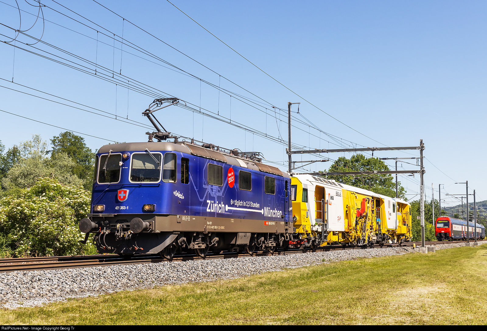 | Re 421 # 383 of SBB Cargo, in the publicity paint scheme for shorter journey times between Zürich and Munich, is pulling the short freight train 69140 from Uzwil to the Limmattal shunting yard. The load is the tamping machine B66U-6 "Palas" of the Sersa (SMG Sersa Maschineller Gleisbau). This machine was built in 2017 bei Matisa and is specialized for tamping of switches. |
