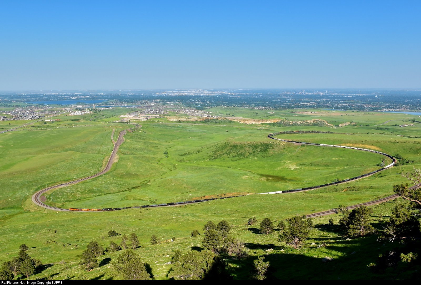 This wide angle view shows BNSF 7068 (ES44C4) leading a long train through Little Ten Curve in the lower left and Big Ten curve on the right. Also visible is the Denver skyline in the upper right and Stanley Lake, Leyden and Arvada in upper left.