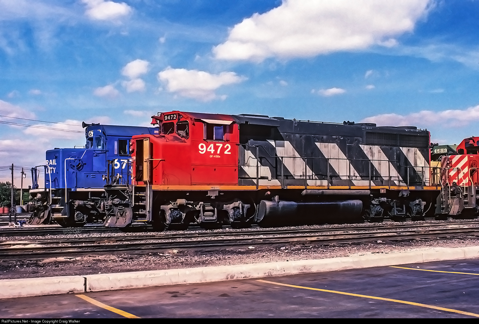 The Belt Railway of Chicago’s Clearing Yard was a great place to find a wide variety of motive power from various railroads, and in Autumn of 1997 An eclectic mix of diesels was found there: A Conrail SD50, a Chicago & North Western SD40-2, a Canadian Pacific SD40 and a Canadian National GP40-2L. CN 9472 was built in July 1974 as a GP40-2 with a lighter frame, hence the "L" in the model designation, and they sit higher than normal GP40-2s (note the taller jacking pads the lighter frame requires - key spotting feature). All GP40-2L locomotives were constructed with the then-new CN-designed comfort-cab, which has a wider nose. (Later CN and GO Transit GP40-2s, with standard frames, were also built with comfort cabs, but their model designation is officially GP40-2 – with no "W" suffix, which is a railfan conceit added, usually in parenthesis, to designate that these engines have a comfort cab. But, officially, the "W" is incorrect.). Photographed on railroad property with permission at BRC’s Clearing Yard in Bedford Park, Illinois, on September 21, 1997.