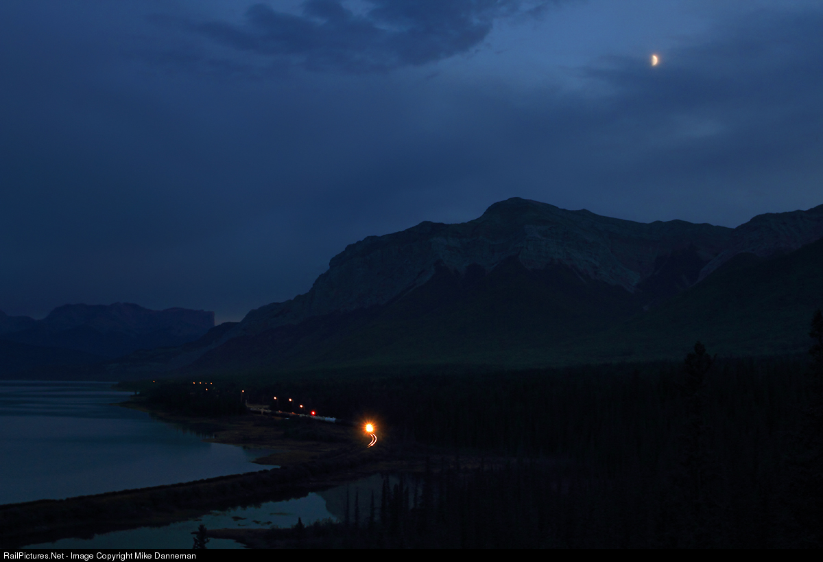 Thin clouds flow through the darkening sky as a waxing moon makes a showing over Canadian National’s main line at Swan Landing, Alberta. Brilliant colors of sunset have disappeared, with the scenery now taking on azure tone of the blue hour. The lights illuminating the small yard there, along with red signals, are the only sign of humankind. It’s a few minutes before 10 p.m. as an eastbound freight shatters the quiet along the shore of Brule Lake as it departs Swan Landing on August 9, 2016.