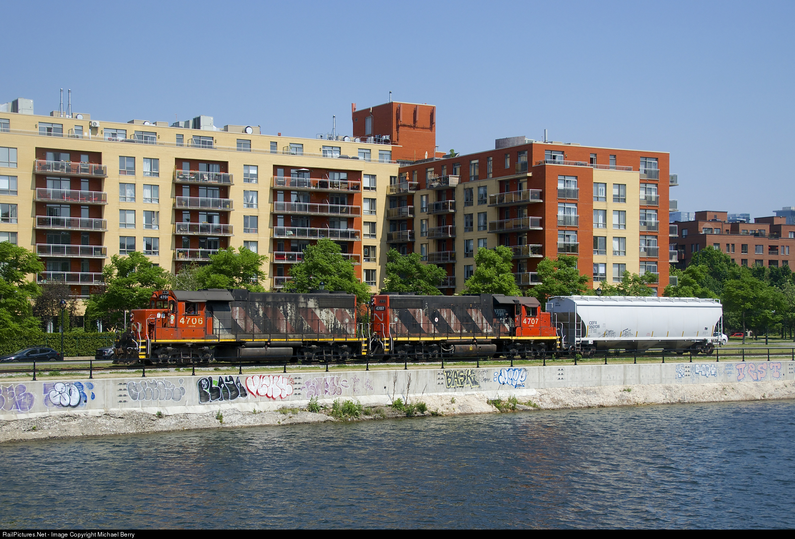 | After dropping off six grain loads at Ardent Mills, the Pointe St-Charles switcher is leaving the East Side Canal Bank Spur with single car for O-I Canada and CN 4706 & CN 4707 for power. |