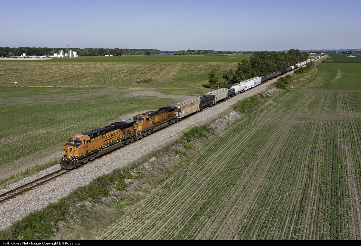 This short BNSF train is in the land between the Mississippi River and the Missouri River as it makes its way to downtown St. Louis. In fact, you can see the Missouri River at the top of the photo. The crops are not looking too good. It's been bone dry and scorching hot here.