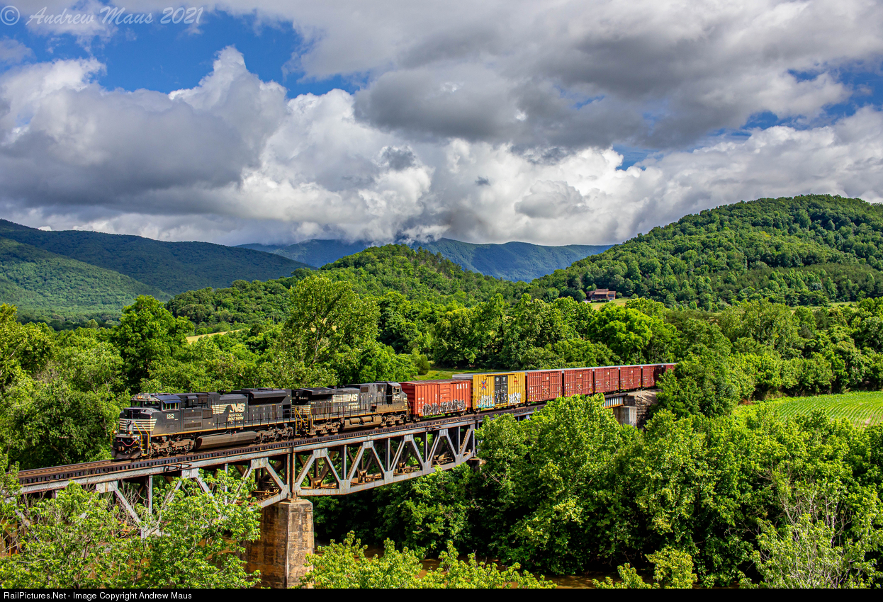 | On a hot and extremely humid June afternoon, northbound manifest 16T crosses the James River and ex-C&O line (now CSX's James River Sub) as it makes its way north through Virginia's Shenandoah Valley. |