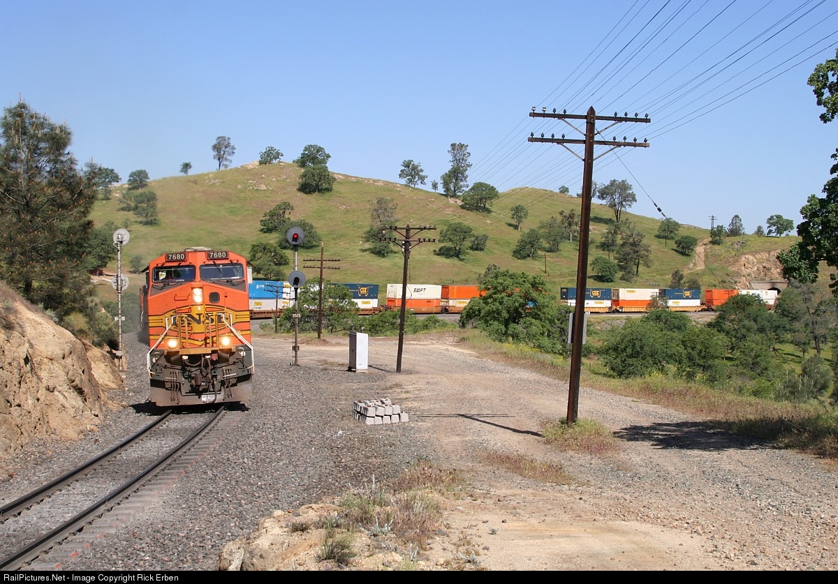 Southbound BNSF 7680 is negotiating the nearly constant curvature on its ascent of Tehachapi Pqss as it passes the intermediate searchlights between Walong and Marcel sidings. In a few years this segment will have a second main track, cut right through the slope of the hill beside Tunnel No.10, from which the train is emerging.
