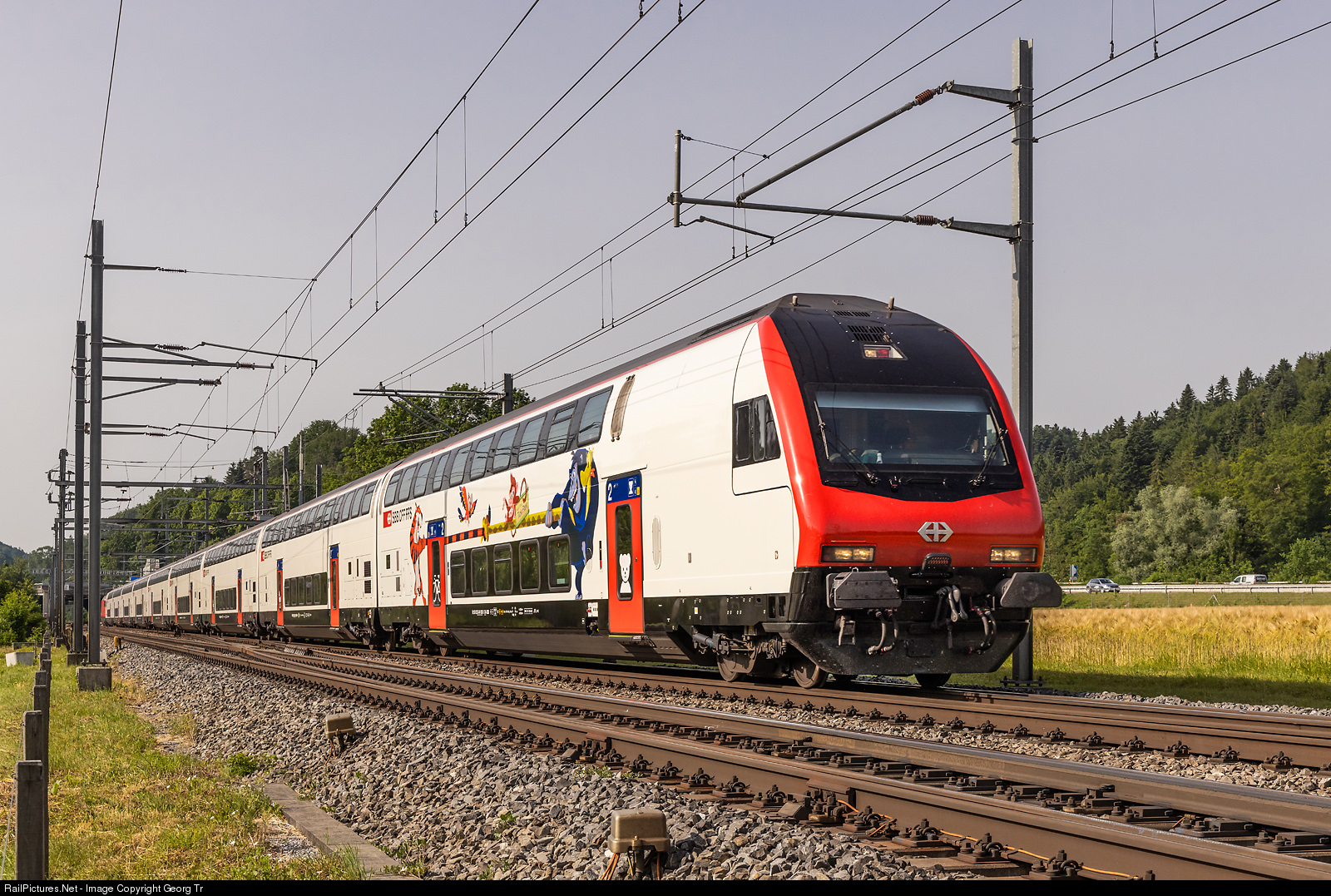 "IC2020" push-pull train of the SBB with leading cab car Bt (2E) and shoving Re 460 # 005 in the rear is running the IR 2111 of the line IR 75 from Lucerne via Zürich-Winterthur-Weinfelden to Constance, in Winterthur Tössmühle. The 341 Intercity doubledeck cars "IC2000" are undergoing a large refit program in about half of their lifetime and are designated new as "IC2020".