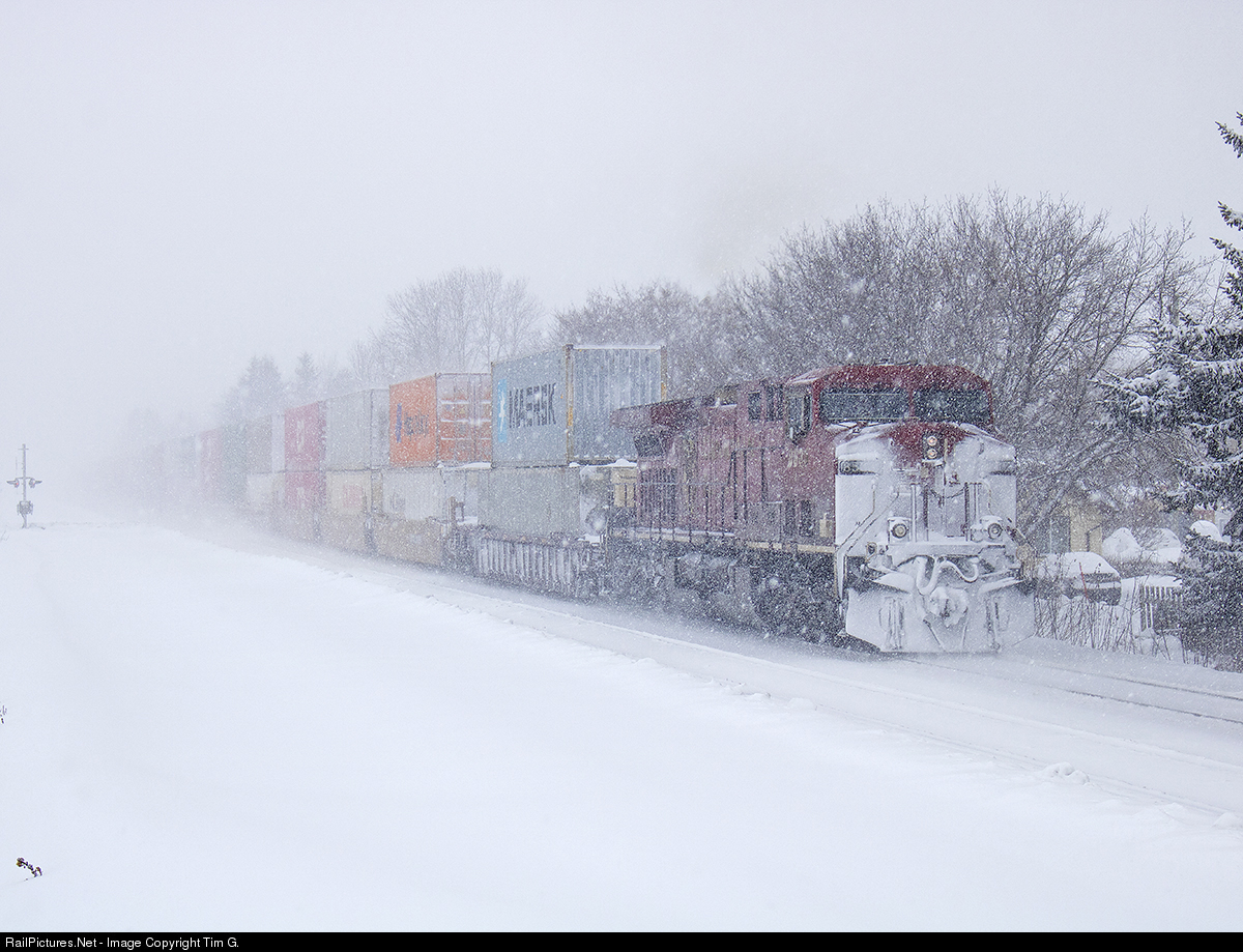 I know I know, one should be shot for posting such an image in June. In one of the worst storms in several years that saw a Colorado low enhanced by lake effect drop 1.5 feet on The Lakehead. CP 8538 shoves 113’s tailend out of Thunder Bay and into the whiteout.