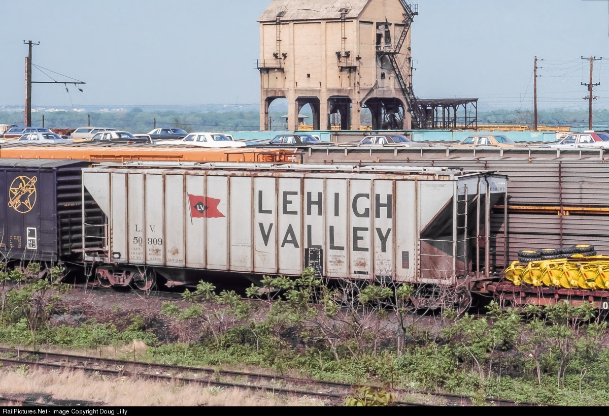 When the Lehigh Valley bought C628’s from Alco in 1965, they were delivered in a striking white, black and red paint scheme and were dubbed “snowbirds” by the local fans. Variants of the snowbird scheme were applied to several classes of freight cars, including this fifty foot covered hopper seen here at Enola, Pennsylvania two years after the LV ceased to exist.