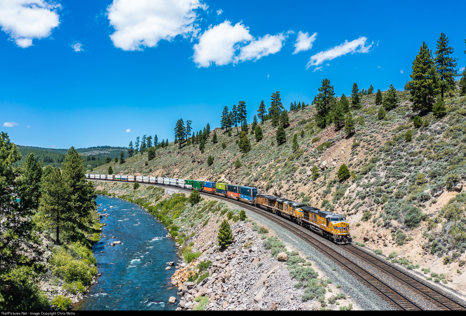 | Sliding eastbound down to Reno Nevada, Union Pacific AC4400CW no.6871 leads stacks down from Donner pass along the Truckee River. |
