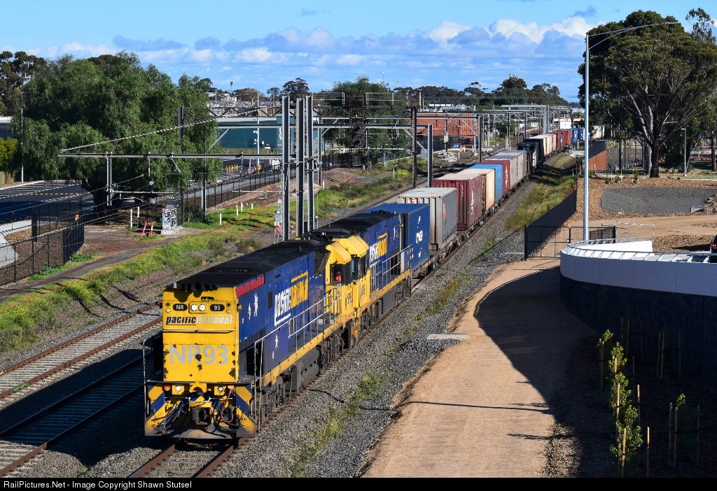 | Pacific National's 7AM5, Intermodal Service thunders through Werribee, Melbourne behind NR93 (LEL) Long End Leading and NR49...