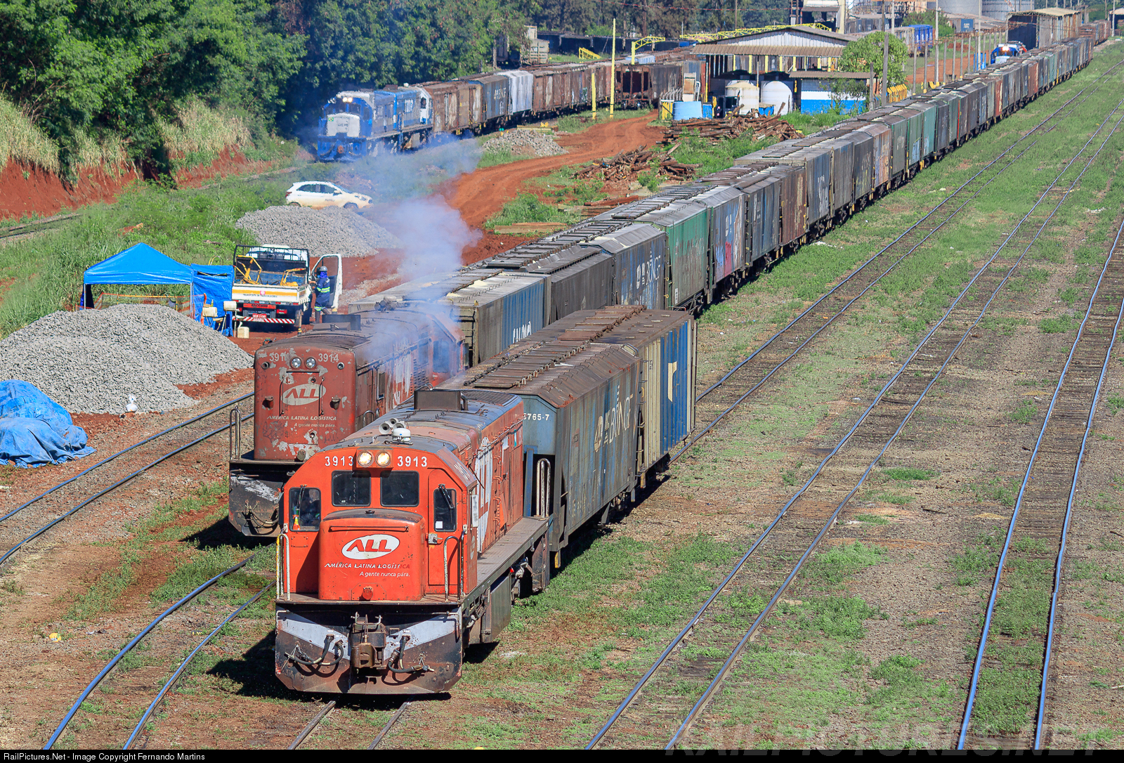 | Operations in the Maringá yard, locomotives moving loaded wagons to form a train for the Port of Paranaguá. Some locomotives still in ALL's painting. |