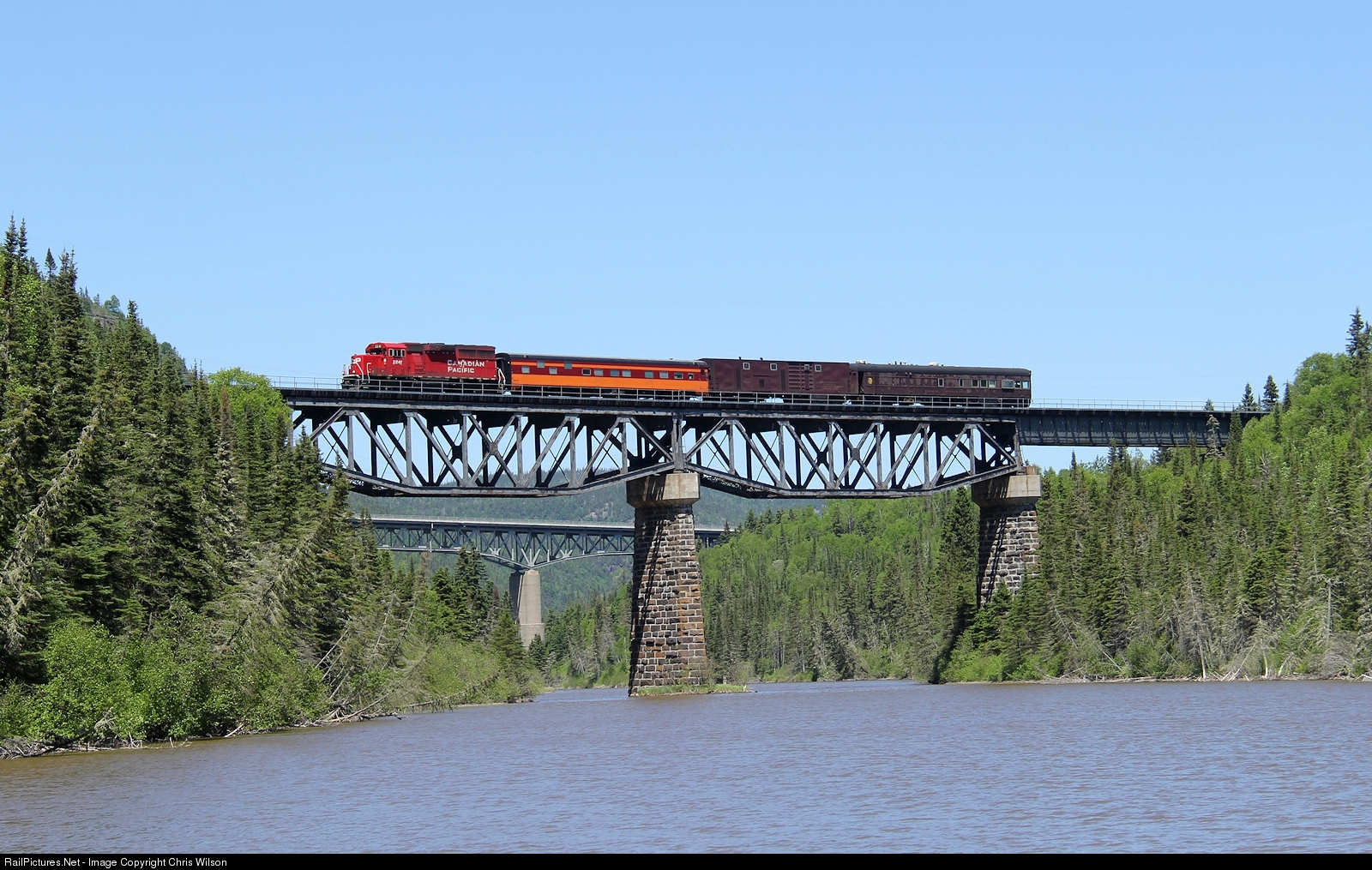 CP's Track Evaulation Train makes its way across the bridge at Neys. That MILW car sure gives the TEC train a nice splash of colour!