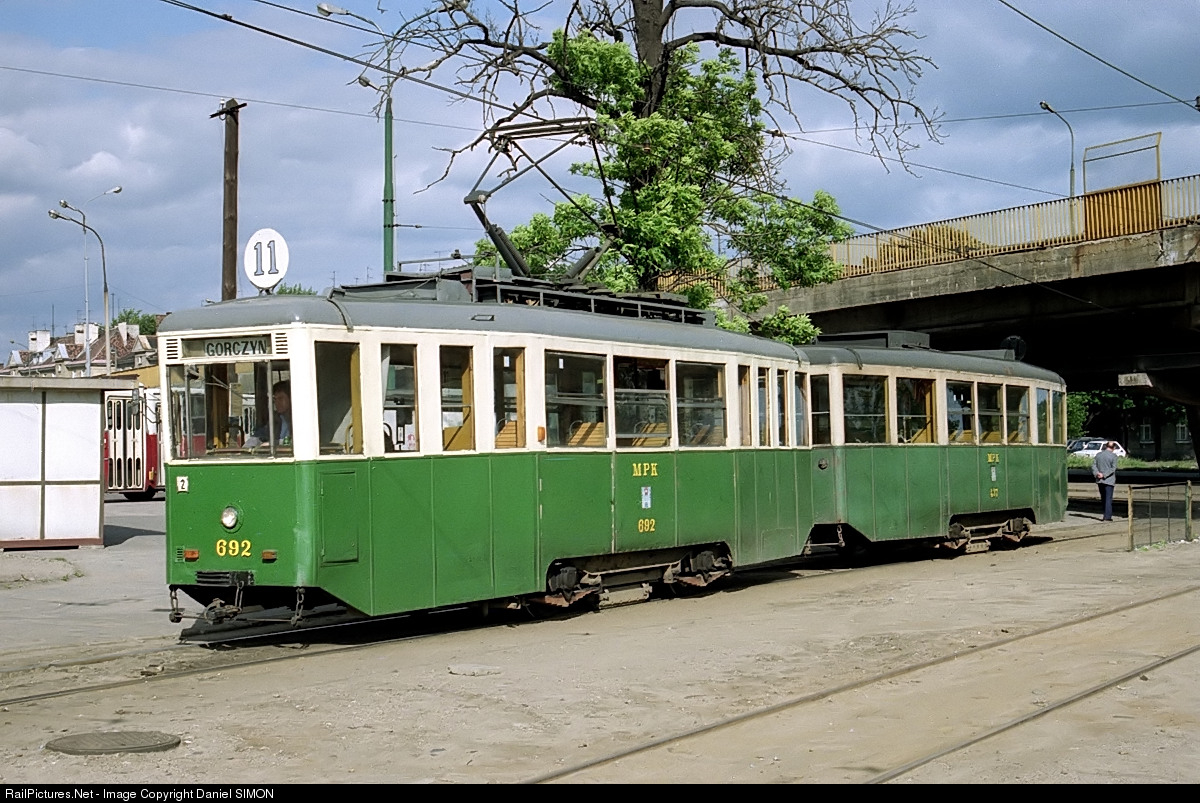 The Konstal 4N type streetcar #692 is awaiting departure from the Gorczyn terminus station at Poznan.