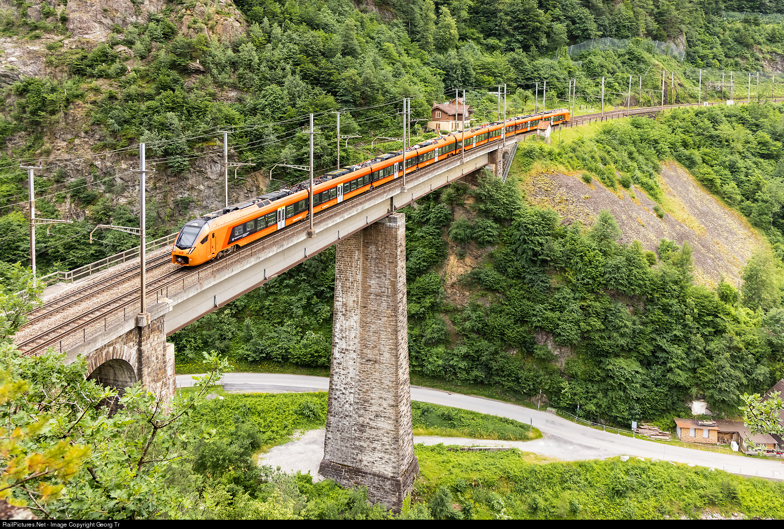 | "Traverso" train RABe 526 # 109/209 of the Südostbahn (SOB) is crossing the Chärstelenbach viaduct on the Gotthard north ramp between Gurtnellen and Amsteg-Silenen, running as IR 2430 "Treno Gottardo" of the line IR 46 from Locarno via Bellinzona-Airolo-Göschenen-Erstfeld-Arth Goldau-Zug to Zürich. |