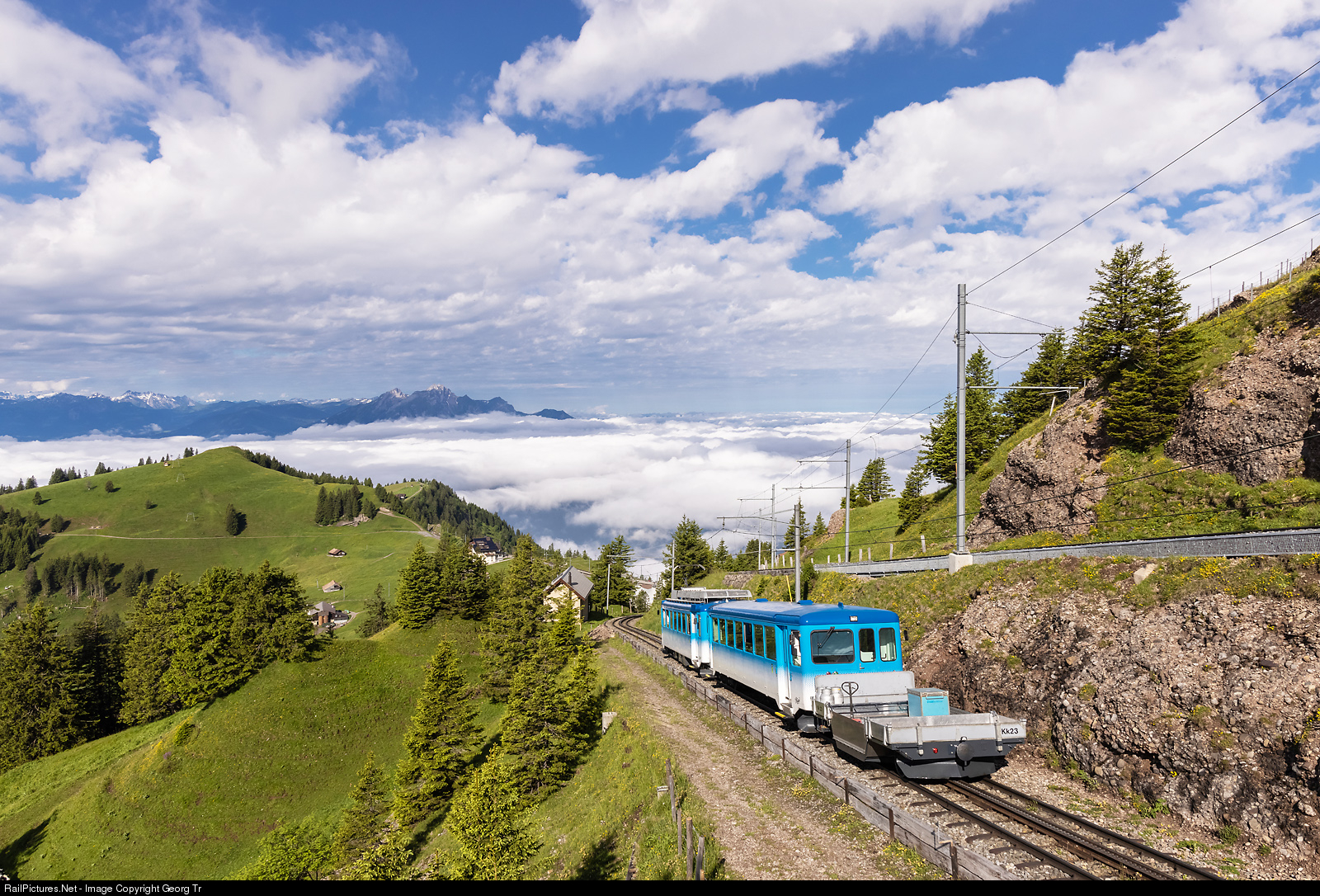 | Cogwheel railcar BDhe 2/4 # 11 of the Rigi Bahnen, built in 1949 for the Arth-Rigi-Bahn (ARB), with cab car Bt # 21 and freight car Kk # 23, is running down from Rigi Kulm to Arth Goldau as train CC 120, between Kulm and Staffel. In the background a sea of fog and low clouds and the Pilatus mountain. |