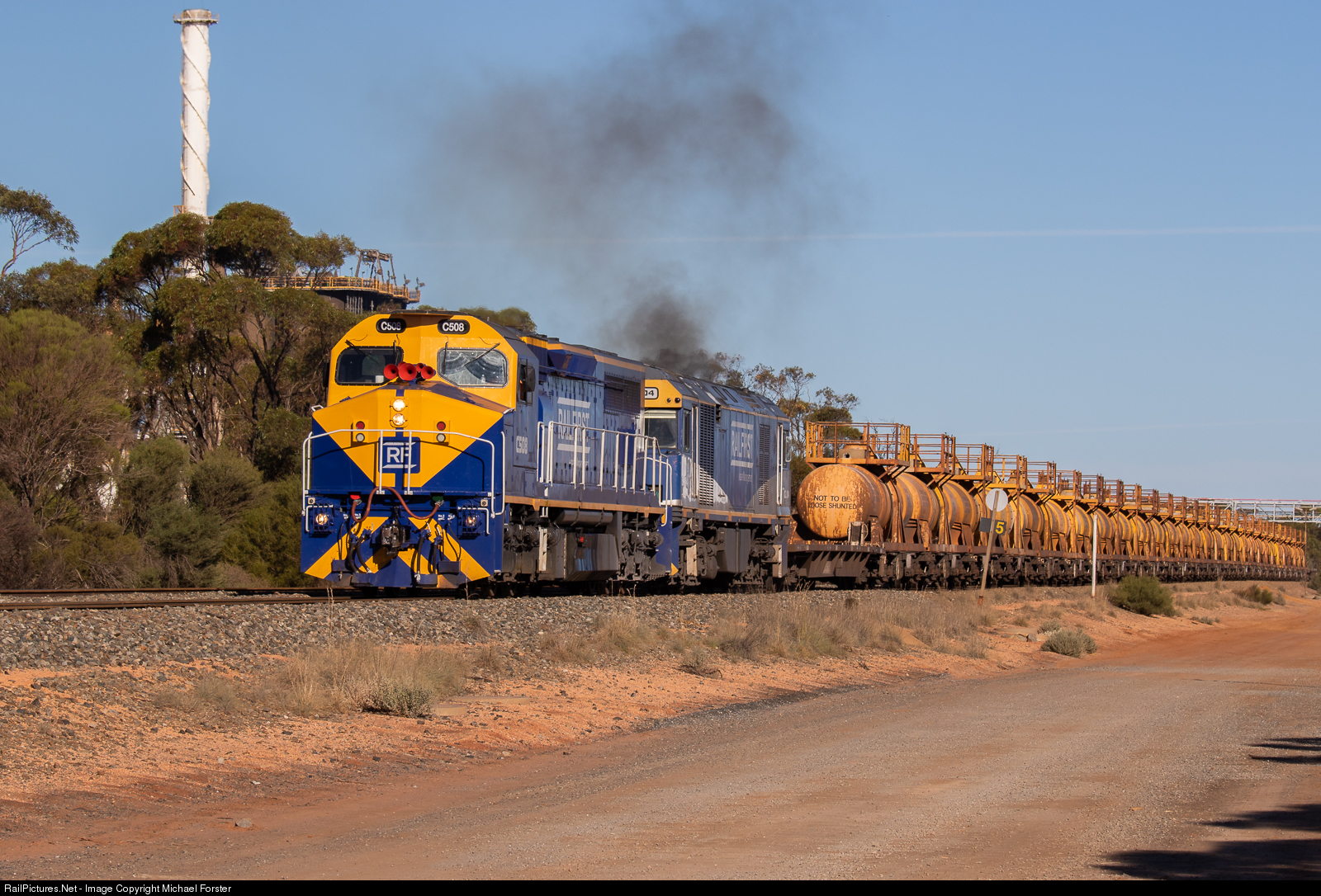 | Watco's latest contract is for BHP's Nickel West service from Kwinana to the Goldfields. Watco have hired locomotives from RailFirst/CFCLA, but also providing their own locomotives, causing some exotic combinations lately. 3 "C Class" locomotives have been hired by Watco. C508 & GL108 depart the NickleWest facility at Hampton near Kalgoorlie. |
