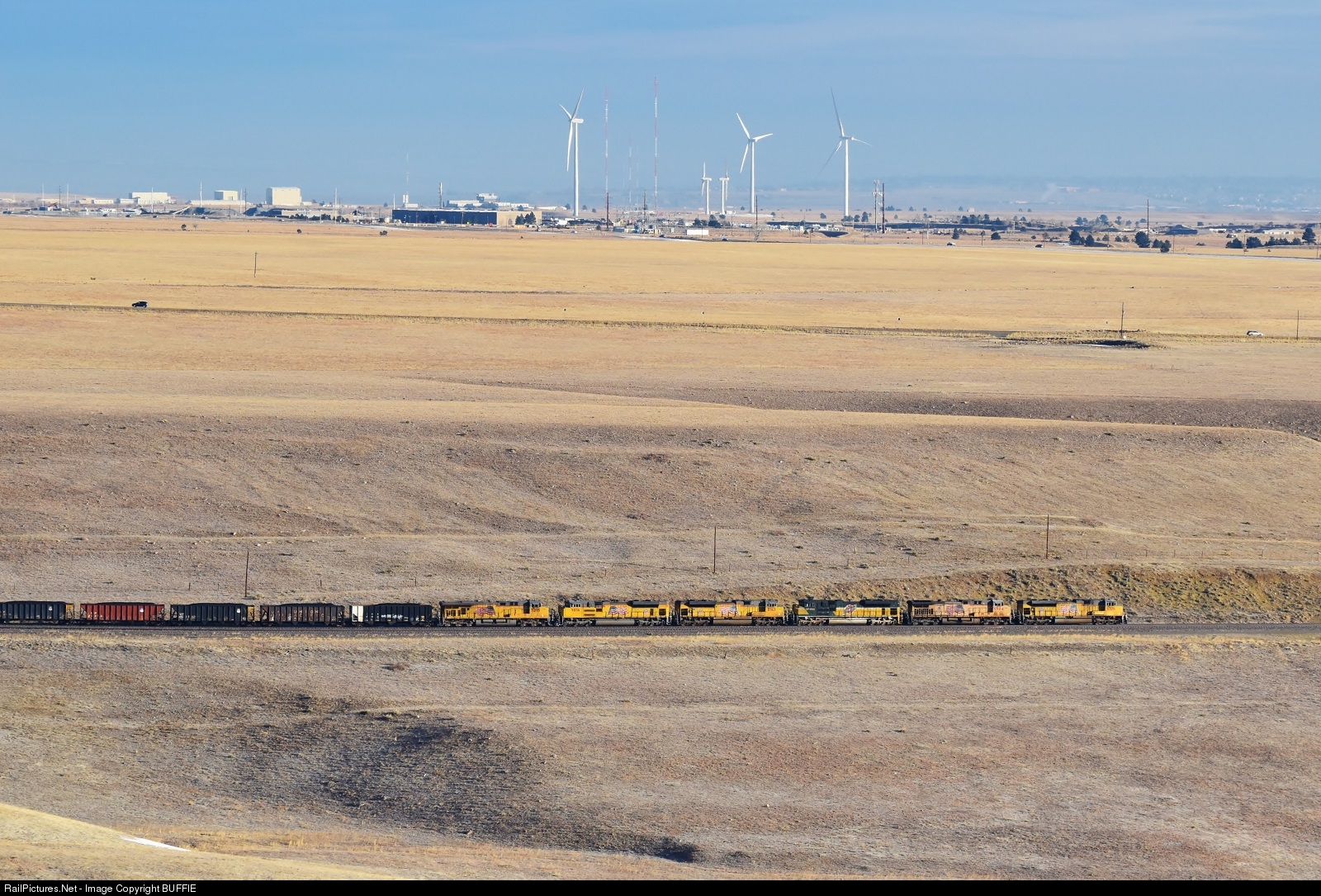 UP 6326 (SD70ACe) leads 5 other engines, including the Western Pacific heritage engine, past the windmills of the ENCAR (National Center for Atmospheric Research) facility in Boulder, Colorado.