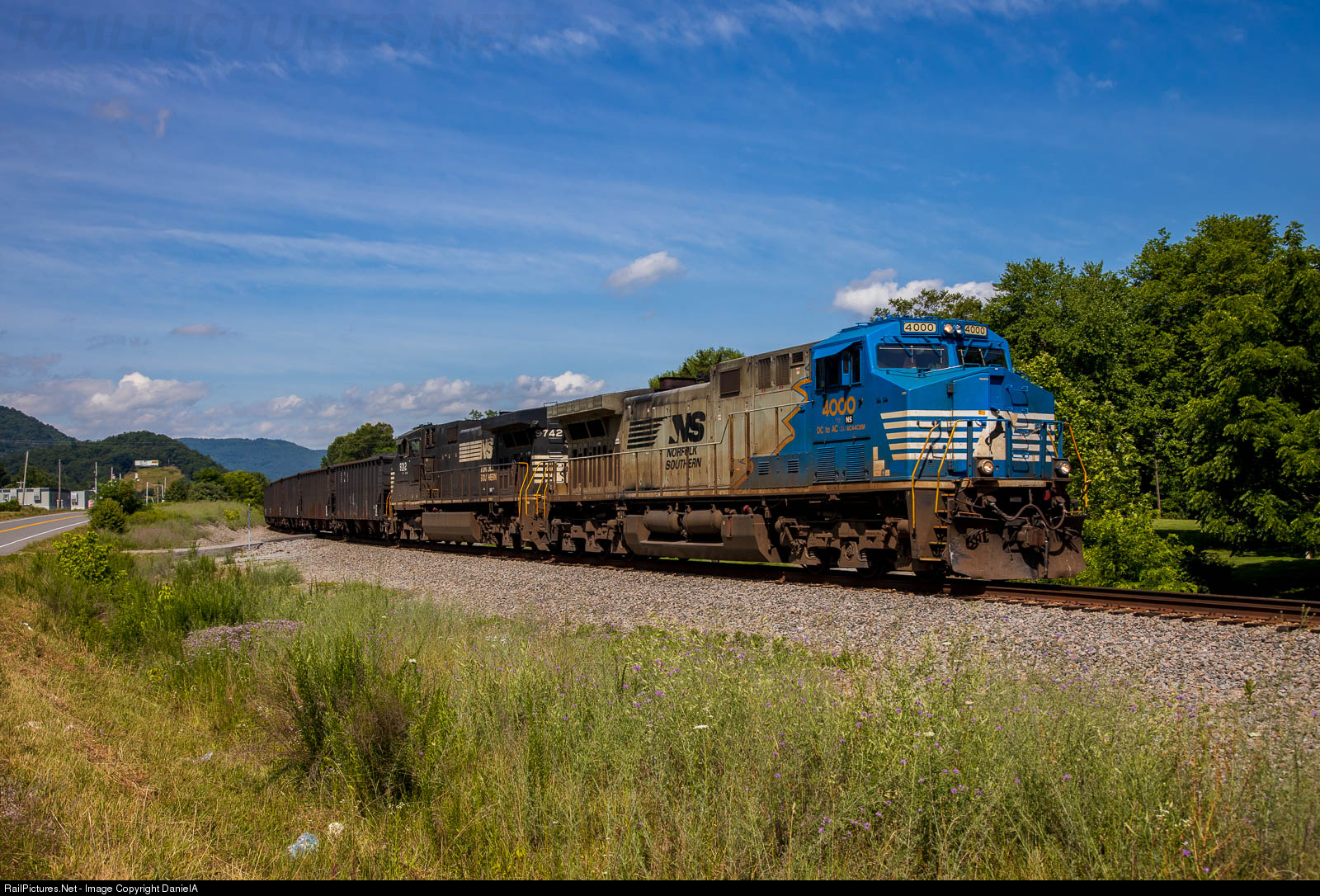 | The blue AC44C6M #4000 leads loaded coal train NS 578 east through Ironto, Va on the Whitethorne district. |