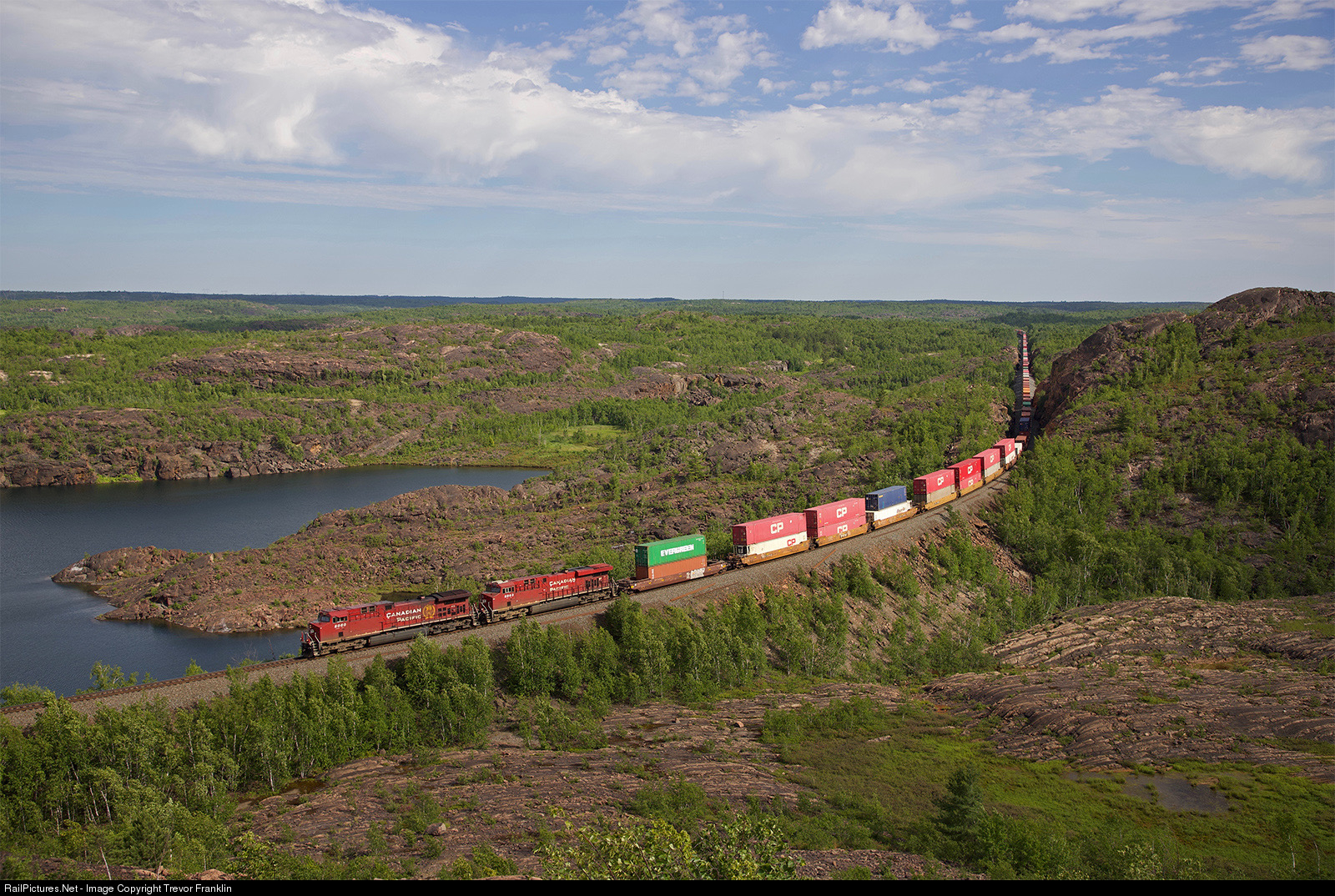 119’s train twists and turns through the big granite rocks south of Romford carving its way through the Canadian shield. This view 20 years ago looked like something out of the moon or as a friend said, reminded him of Chile, with virtually no greenery or foliage at that time. Since then, the heavy mining activity in the area has adopted more environmentally friendly practices and this scene, along with many others around Sudbury, is looking much more alive these days.