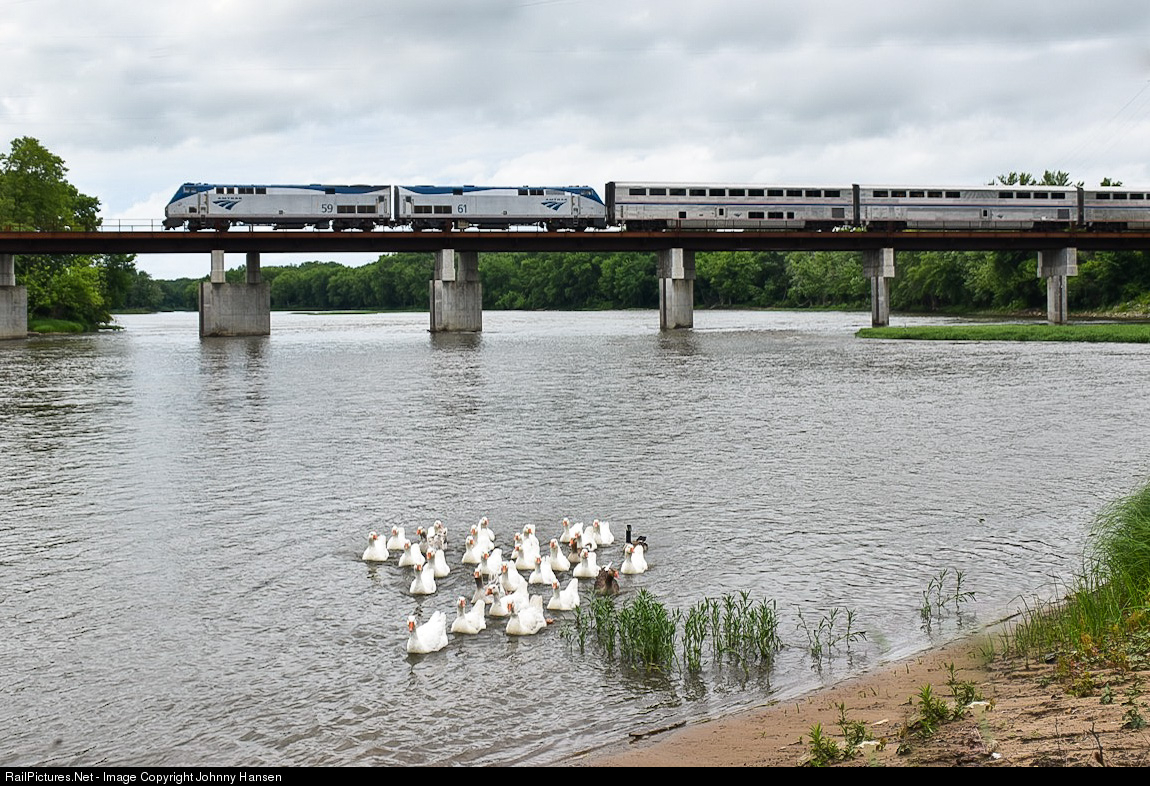 | Amtrak’s Texas Eagle #21 heads south over the Kankakee River on the UP Joliet Subdivision with 2 P42DC’s, #’s 59 and 61. The Wilmington Goose Association poses for the photo while the train crosses the river. |