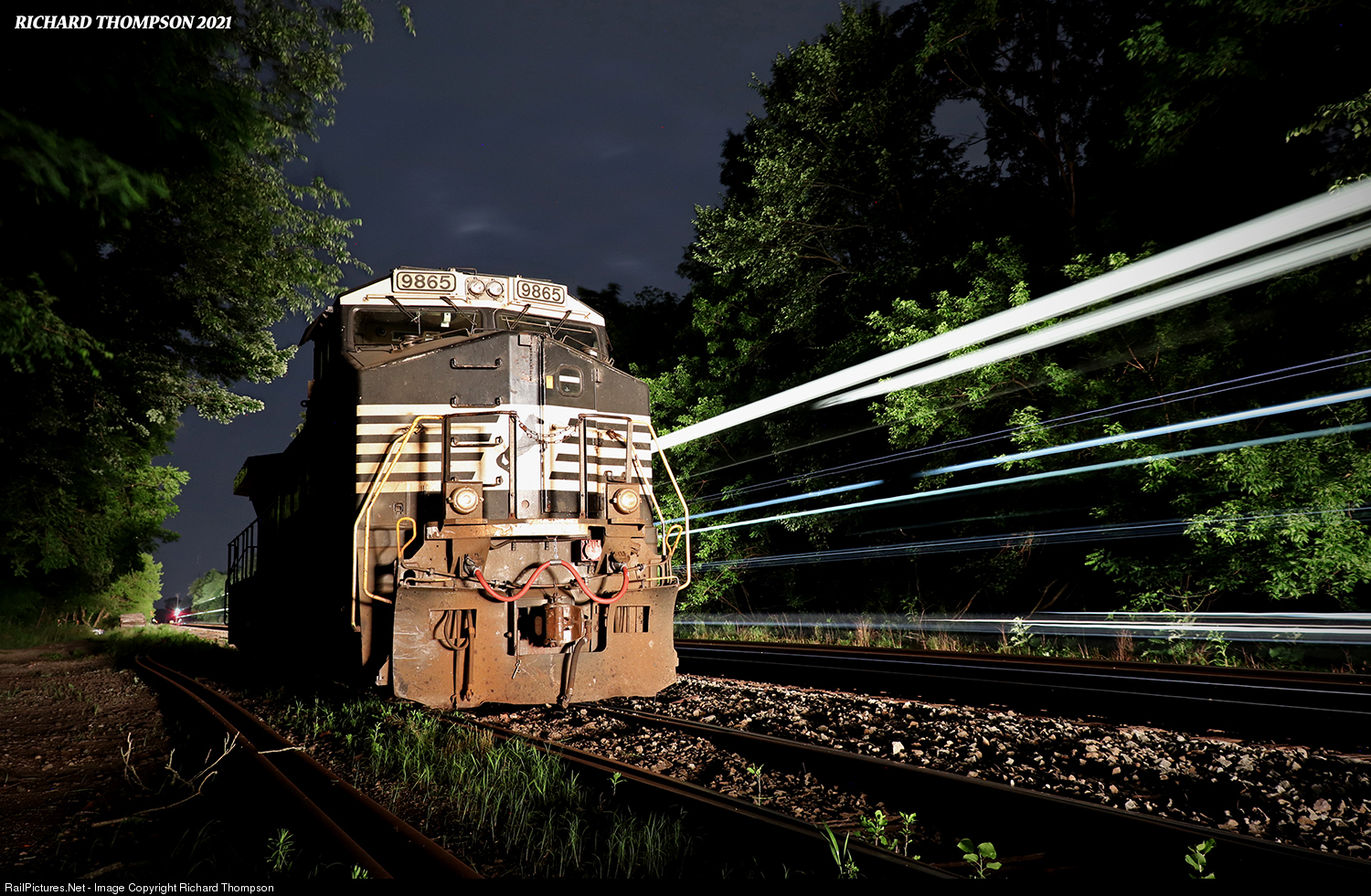 | NS 9865 has suffered some sort of mechanical failure and has been bad-ordered and set out at Blackhorse siding in Ravenna, Ohio. A crude oil train streaks by on the NS Cleveland Line at right. |