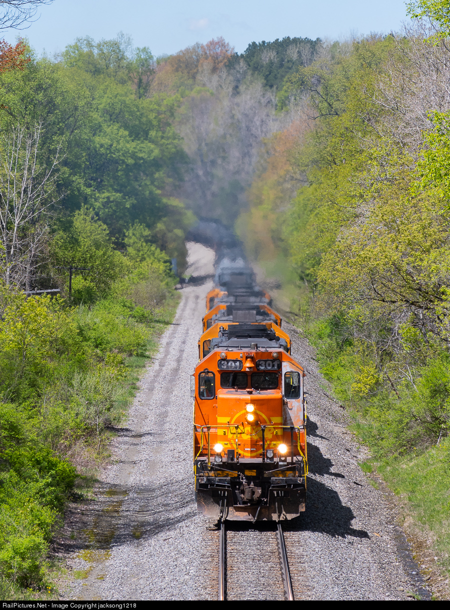 Buffalo and Pittsburgh train BFSI works hard upgrade with a quartet of EMD SD40s as it approaches the South Protection Road overpass just north of Arcade, NY. Leading the train is the last ex QNSL SD40 on the B&P, with the other two, 307 and 309 now on the Chicago, Ft Wayne and Eastern.