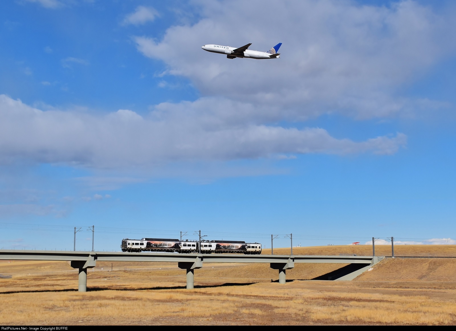 RTD commuter rail train 4023 (Hyundai Eagle P3) leaves Denver International Airport just as a United Airlines plane does the same. The train's trip will take it to downtown Denver, Colorado and the United plane heads to Honolulu, Hawaii.