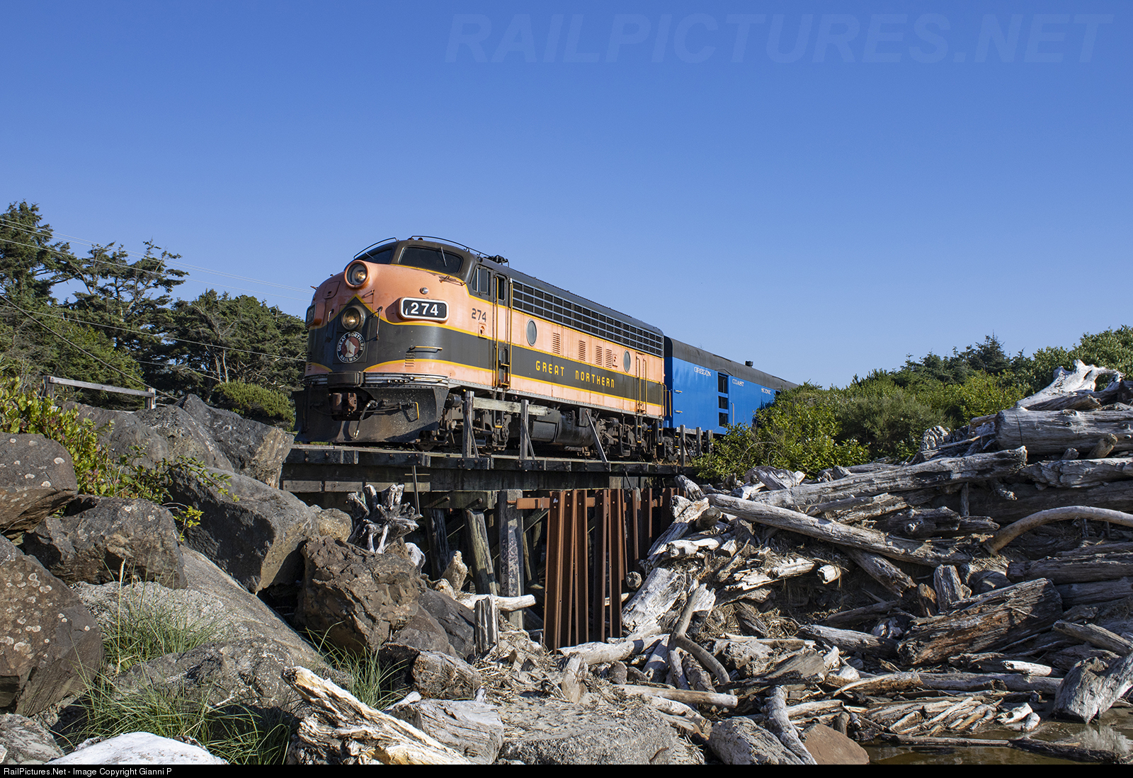 Seemingly out of place on the Oregon coast, GN 274 trundles through the beach town of Rockaway with the dinner train in tow. This locomotive was restored by Doyle McCormack, and is now owned by OCSR after being landlocked on the coast.