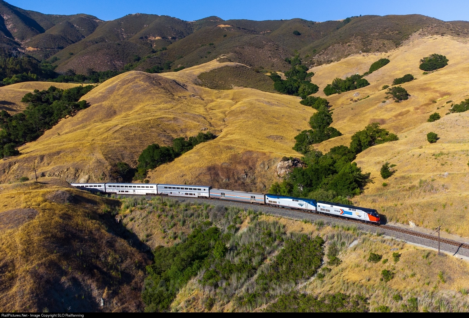 In the late afternoon on June 27, 2021, AMTK 161, one of the new 50th Anniversary painted units leads the northbound Coast Starlight 14 over Cuesta Pass.