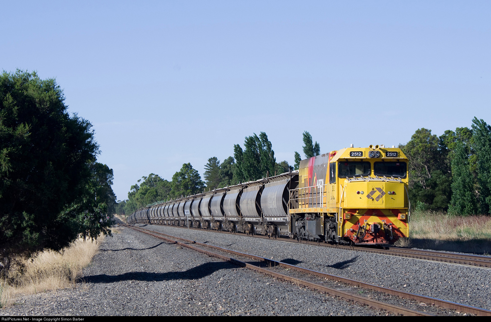 2512 works a loaded Alcoa alumina train south through the crossing loop station at Benger.