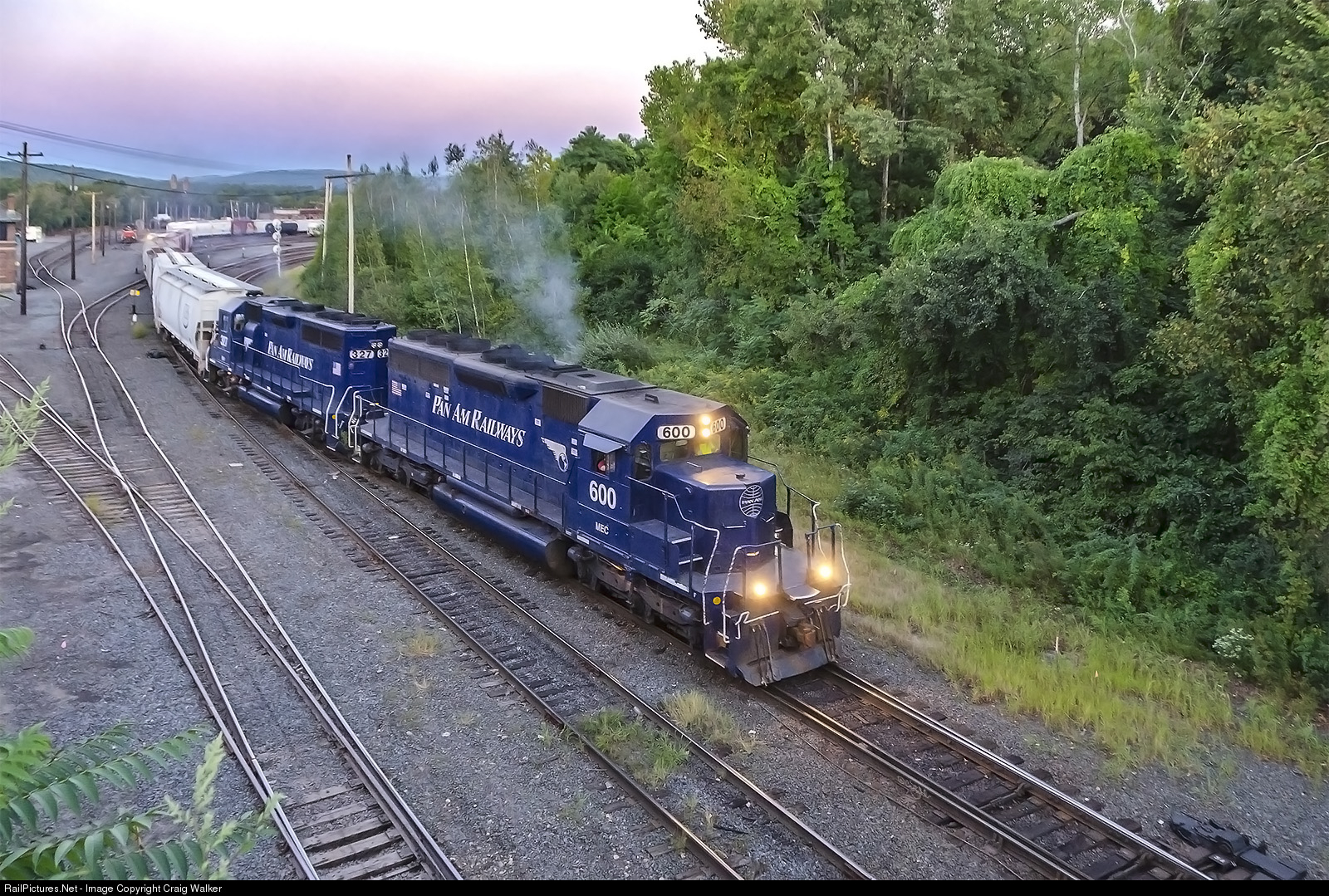 As the sun drops behind the Berkshire Mountains to the west, Pan Am Railways train EDBF snakes out of the East Deerfield Yard to begin its run to Bellows Falls, Vermont. Maine Central SD40 600 (ex-KCS 3126, ex-KCS 698, née-QNSL 203) and Boston & Maine GP40 327 (ex-CR 3239, née-PC 3239) are the power for this evening’s train. (East Deerfield Massachusetts – September 13, 2016)