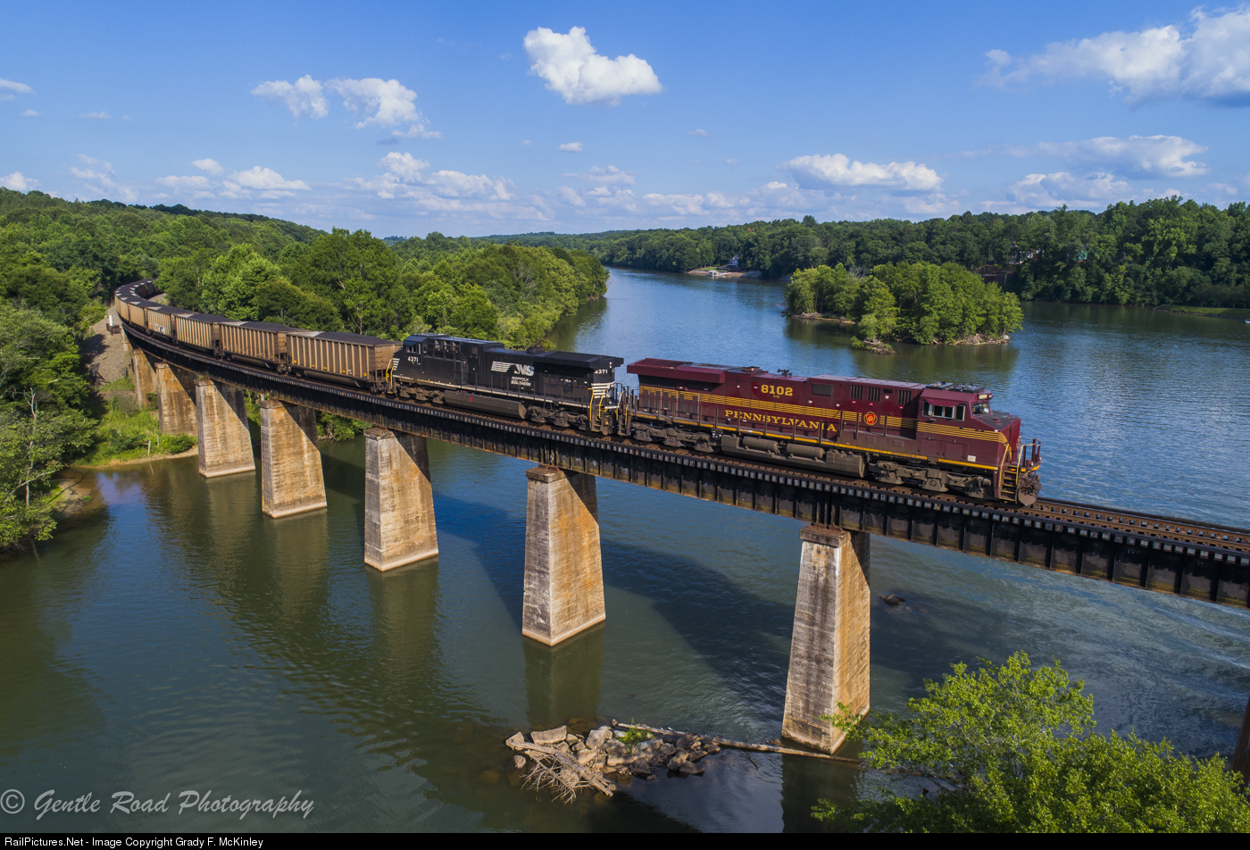 | Norfolk Southern train 744 crosses the Catawba River at Catawba, NC and soon the crew will swap ends and use the DPU power to take the train into the plant. |