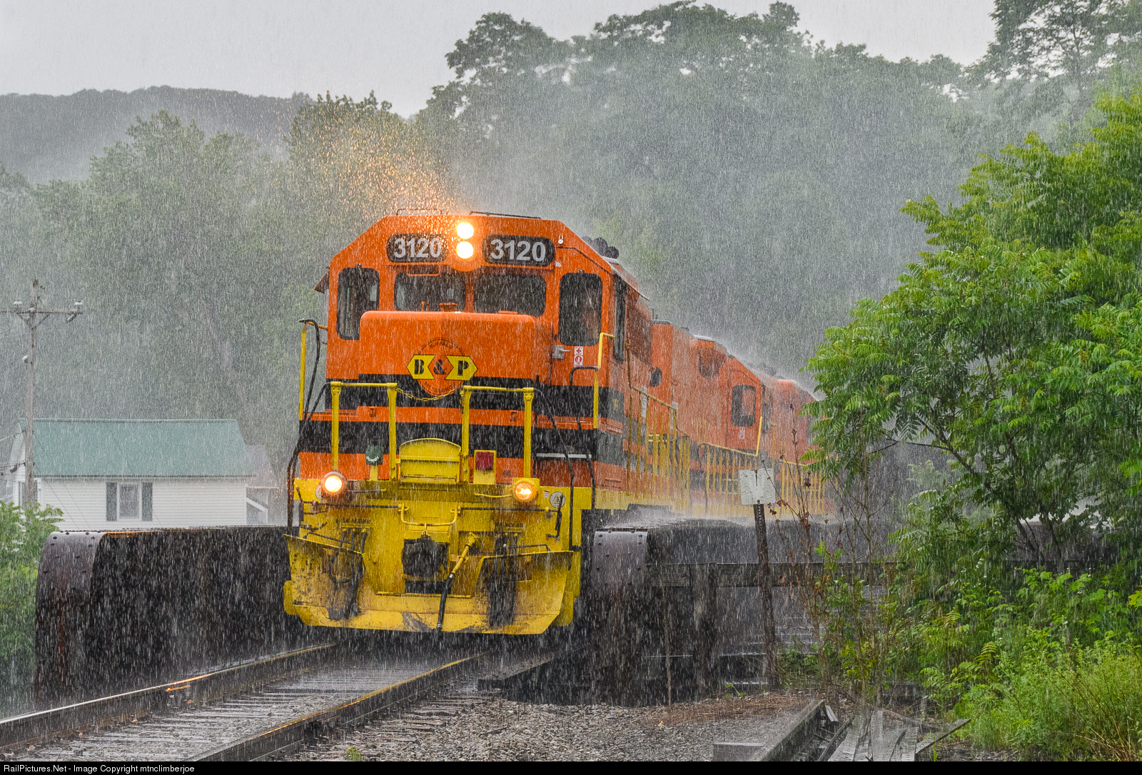 | A summer thunderstorm lets loose with heavy rains in Irvine, Pennsylvania as the Buffalo & Pittsburgh's WAER crosses over Brokenstraw Creek, returning towards Warren with a trio of GP's pulling stone empties. |