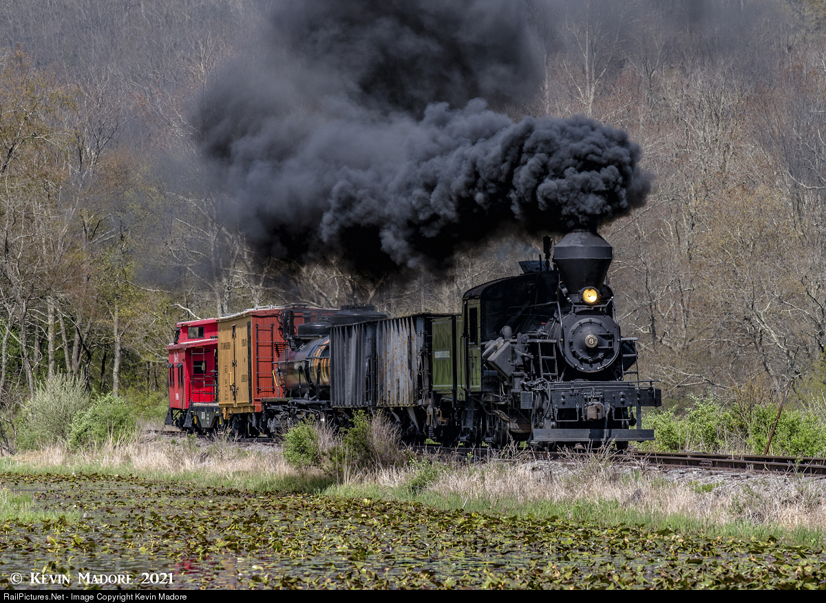 Working south with the local. Meadow River Lumber Co.'s 90-Ton, 3-Truck, Heisler #6 works her way south past the lily pad-covered Allegheny Run at MP 88.2 on the C&O Greenbrier Division, headed south to Cass with some loads for interchange. This re-creation of a West Virginia local freight was staged on the Durbin & Greenbrier Valley Railroad, in the tiny hamlet of Hosterman, WV, during a 2021 Lerro Photography event.