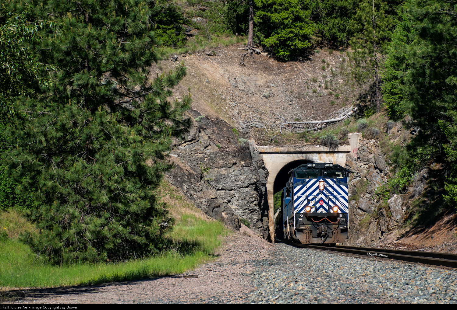 | MRLs Night Gas train can be see here flying through a tunnel along the tiny town of Cyr, MT, with a pair of MRLs finest Aces for power. |