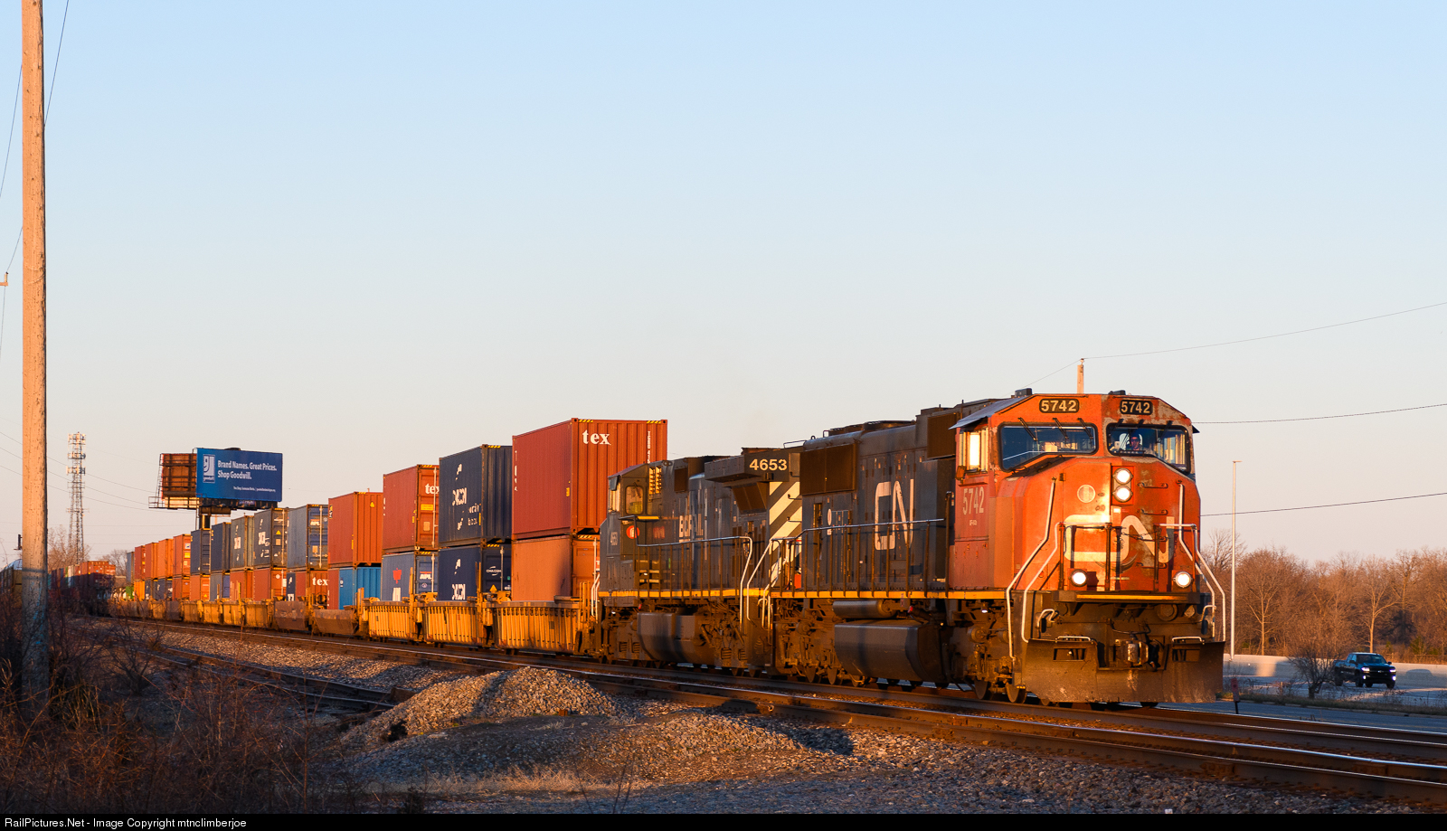 | CN intermodal Q148 is illuminated by the first rays of the rising sun as they roll along I-69 through Flint, Michigan behind an SD75I and a BC Rail Dash 9. |