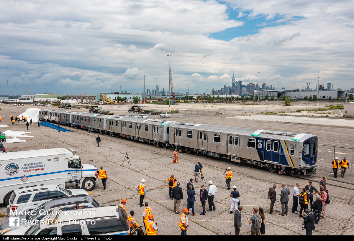 The Reveal. Shipped under cover and moved in darkness, at just after 1100 on Thursday, July 1, 2021, Metropolitan Transportation Authority - MTA NYCT Subway Kawasaki built R-211As were revealed to the public for the first time. NYCT 4060-4064 comprise a 5 car set of the next generation of subway car for New York City, and include a variety of improvements over recent R-160s/R-179s for the B Division. The Brooklyn Marine Terminal in Brooklyn, New York was the perfect setting to include the Freedom Tower and Manhattan skyline in the background.