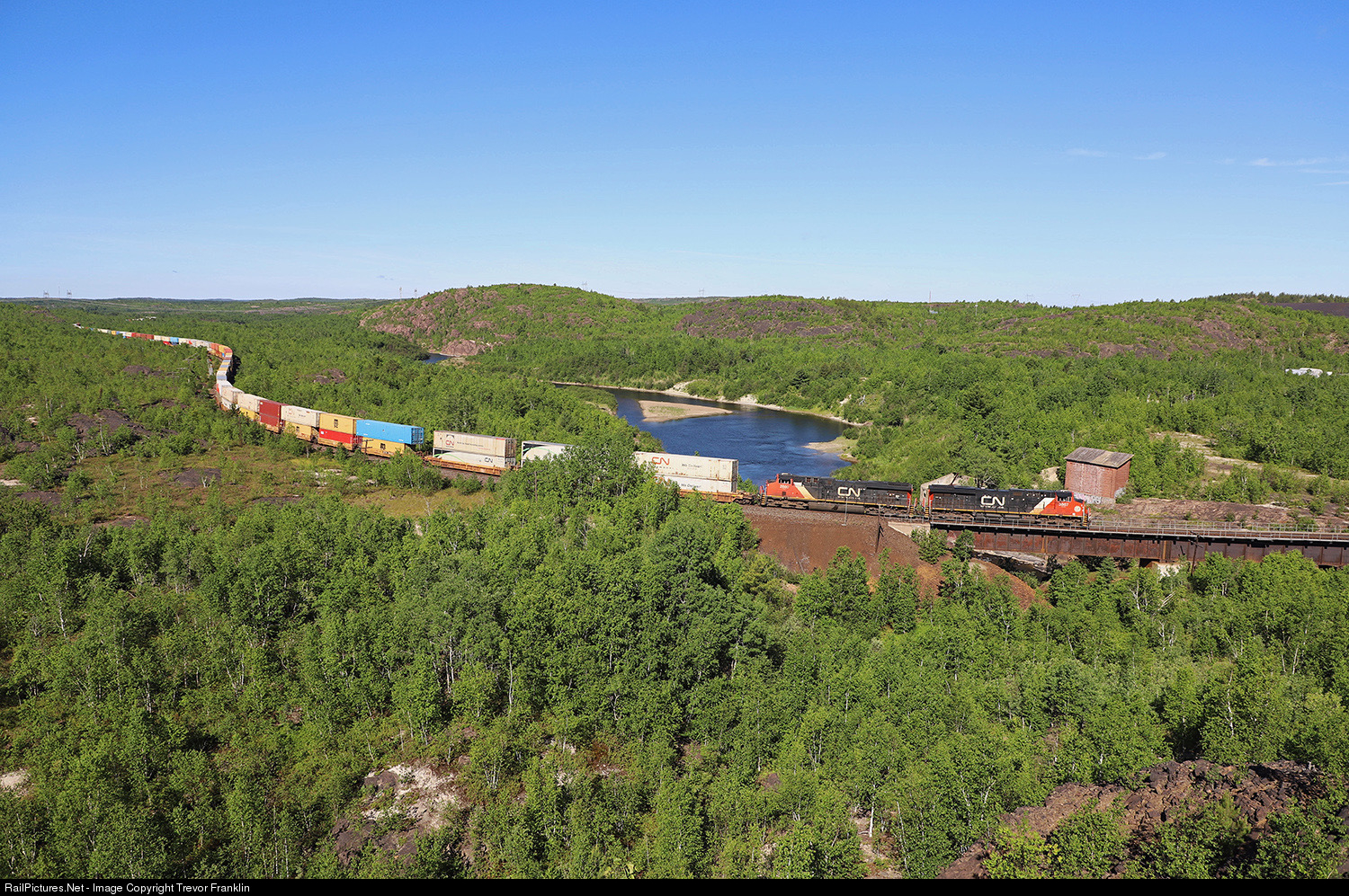 An early morning stack train winds its way north crossing the Wanapitei River amidst the rugged landscape around Coniston.
