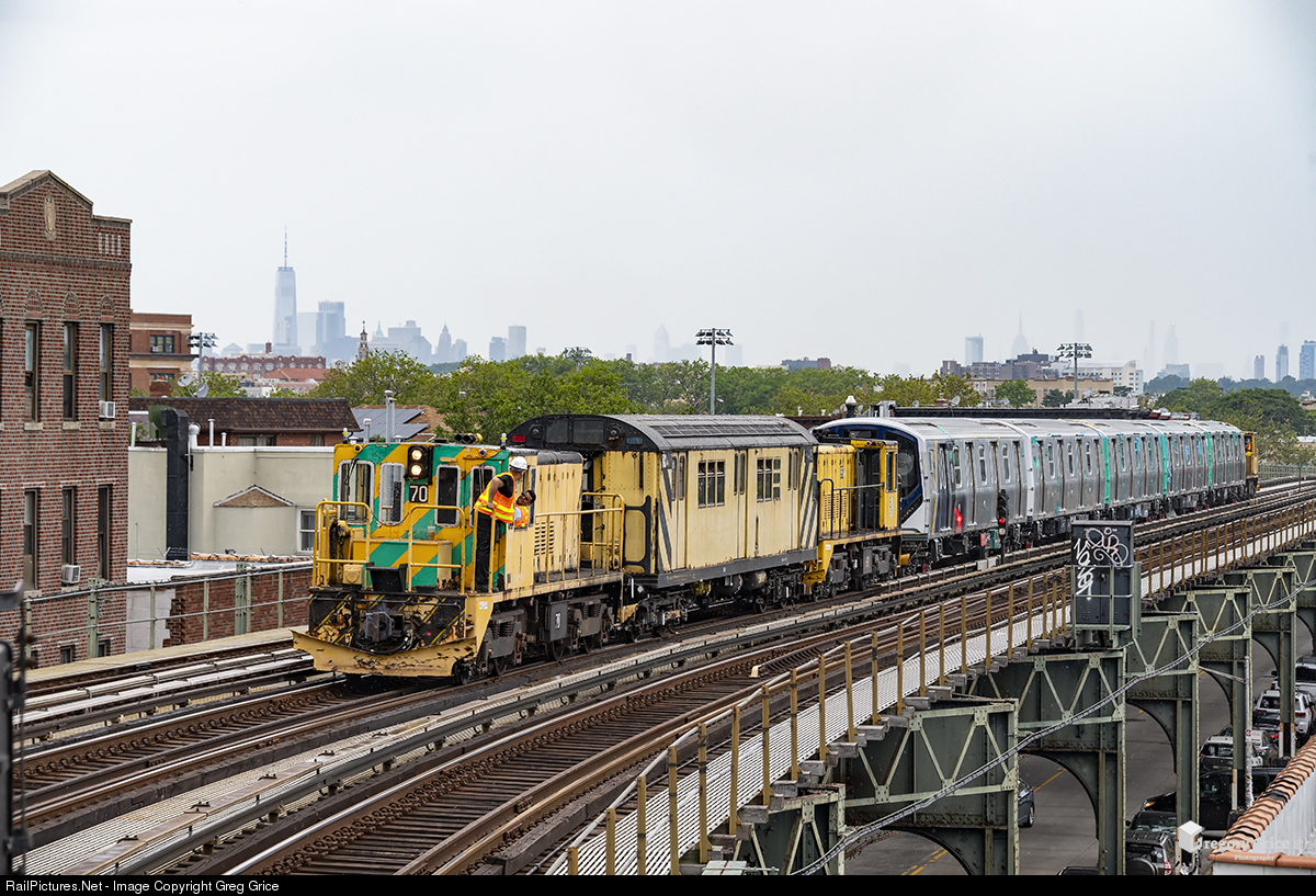 New York City Transit GE 47-Ton diesel #70 leads a work train towing the first 5-car set of Kawasaki built R211A subway cars down the BMT West End Line at 18th Avenue. The cars are on their way to Coney Island Shops after delivery and an unveiling ceremony at the Brooklyn Marine Terminal.