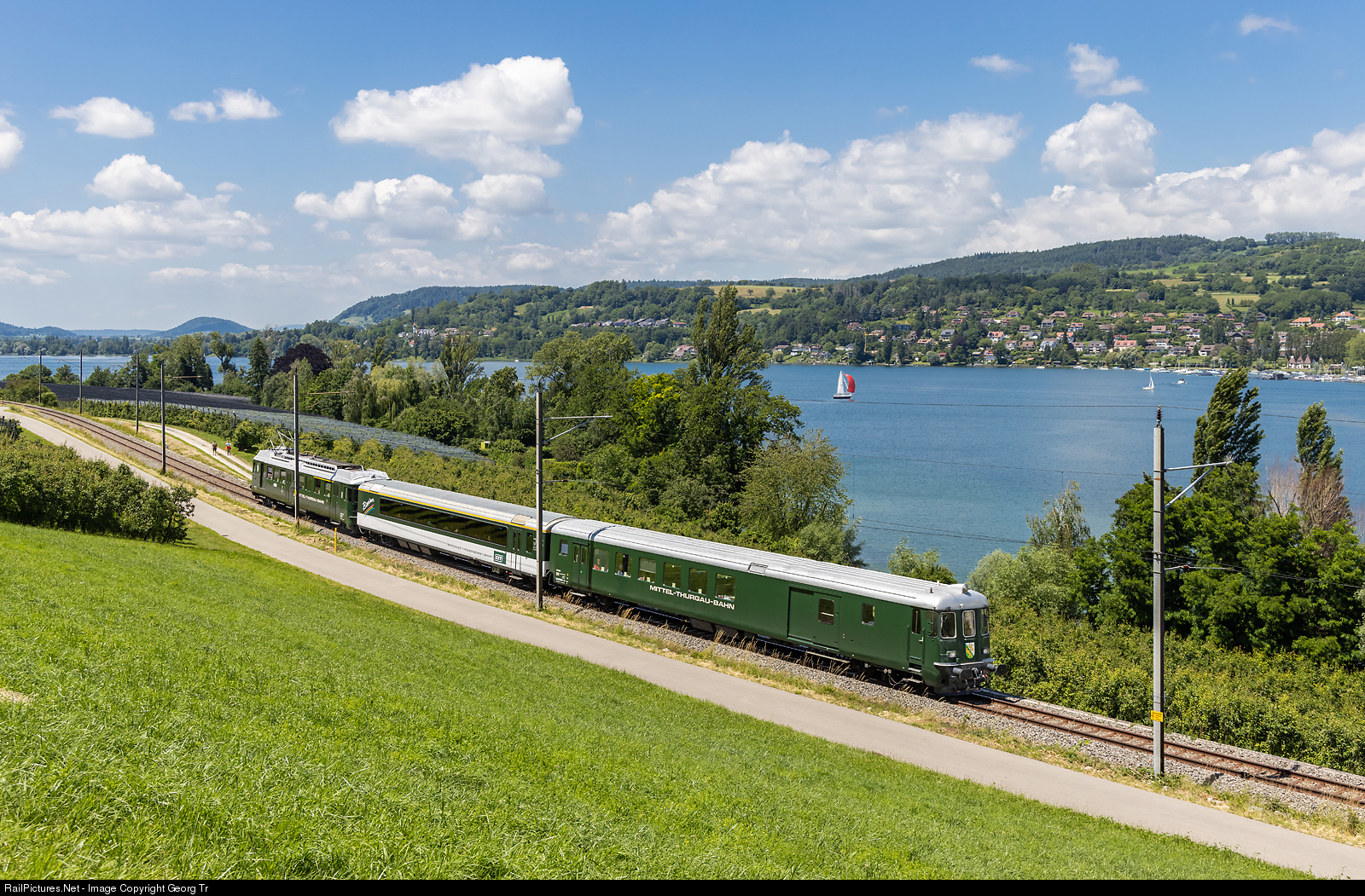 Push-pull train of the association historic Mittel-Thurgau-Bahn (VHMThB), called "Thurgauer Zug", with cab car Bt # 205, parlor car A # 719 "Bodan" of the former Bodensee-Toggenburg-Bahn, and railcar ABDe 4/4 # 12 "Weinfelden" (built in 1965 by SIG, SWS, SAAS, BBC, MFO for the Mittel-Thurgau-Bahn, since 2006 running for the VHMThB), running along the Untersee (part of Lake Constance) between Mammern and Steckborn. The train is on a journey for a group from Stein am Rhein via Kreuzlingen to Siegershausen, then via Kreuzlingen to Romanshorn.