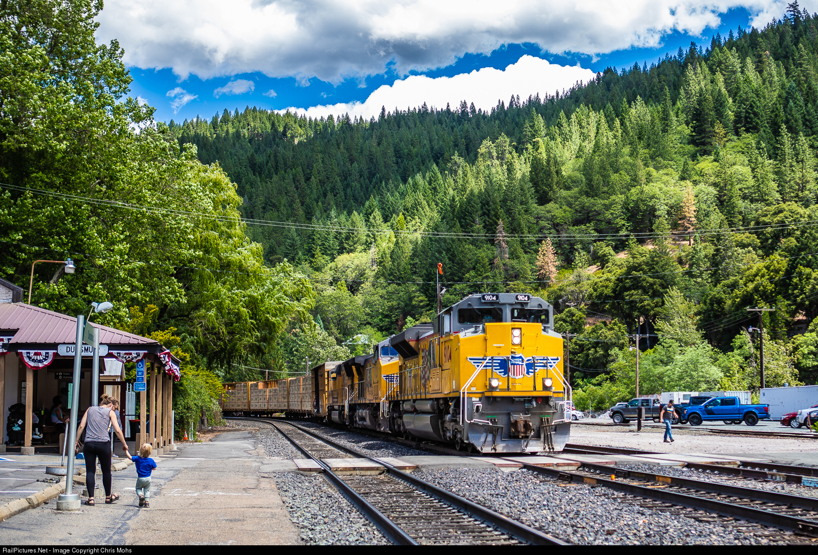 Just like a lot of us got our start with the fascination of trains, a young boy and his mom watch the departure of a manifest from Dunsmuir California.