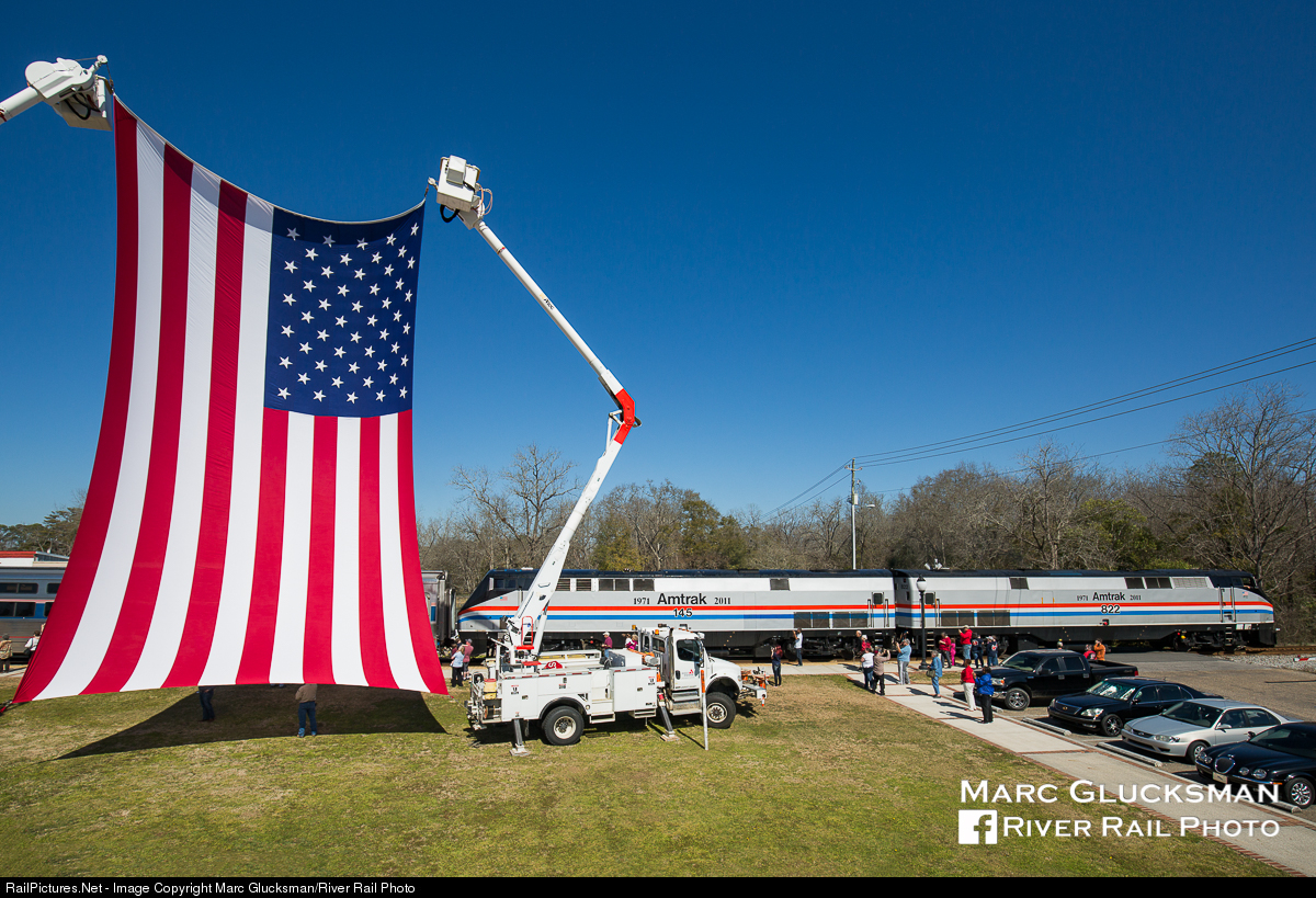 Stars And Stripes. As AMTK 822 (P40DC) pulled into the former Chipley, Florida Amtrak Station with the Amtrak Gulf Coast inspection train P960 on February 19, 2016, local utility trucks held up an enormous American Flag to mark the occasion. Service to this station and all points east of New Orleans, LA on the Sunset Limited route was suspended on August 29, 2005 ahead of the arrival of Hurricane Katrina, making this was the first and to date only Amtrak train to travel the line since.