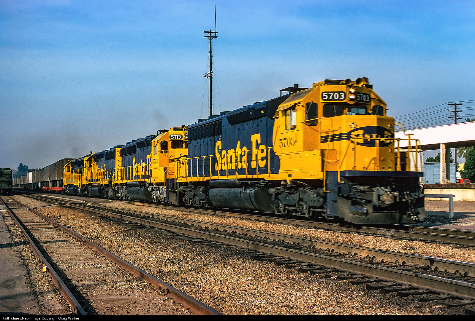 Speeding through the passenger station in Fullerton is Santa Fe train 891, the eastbound Super C. Known as the "World's Fastest Freight Train," the Super C was an all-piggyback train that traveled the 2200-miles (3500 km) between Los Angeles CA and Chicago IL in 40 hours – faster than Amtrak’s Southwest Limited. On this morning, the 891 is powered by a quartet of 19-month-old EMD SD45-2s, led by ATSF 5703. Before much longer, the 5703 would be sent to the shops in San Bernardino and emerge as the fourth of five Bicentennial engines, all SD45-2s, usually assigned to the hot and high-profile Super C. (n late 1987, this engine would be rebuilt into an SD45-2B (ATSF 5512), which would become BNSF 7506 when ATSF merged with the Burlington Northern in 1996. BNSF would later renumber it BNSF 6522, and then GN 6522 (the archaic reporting mark “GN” was used on locomotive es that were slated for retirement). This locomotive, while no longer on the BNSF roster, still exists. Plans for it, at this time, have not been made public. Click HERE to see ATSF 5703 in Bicentennial colors. (Fullerton, California – December 27, 1974)