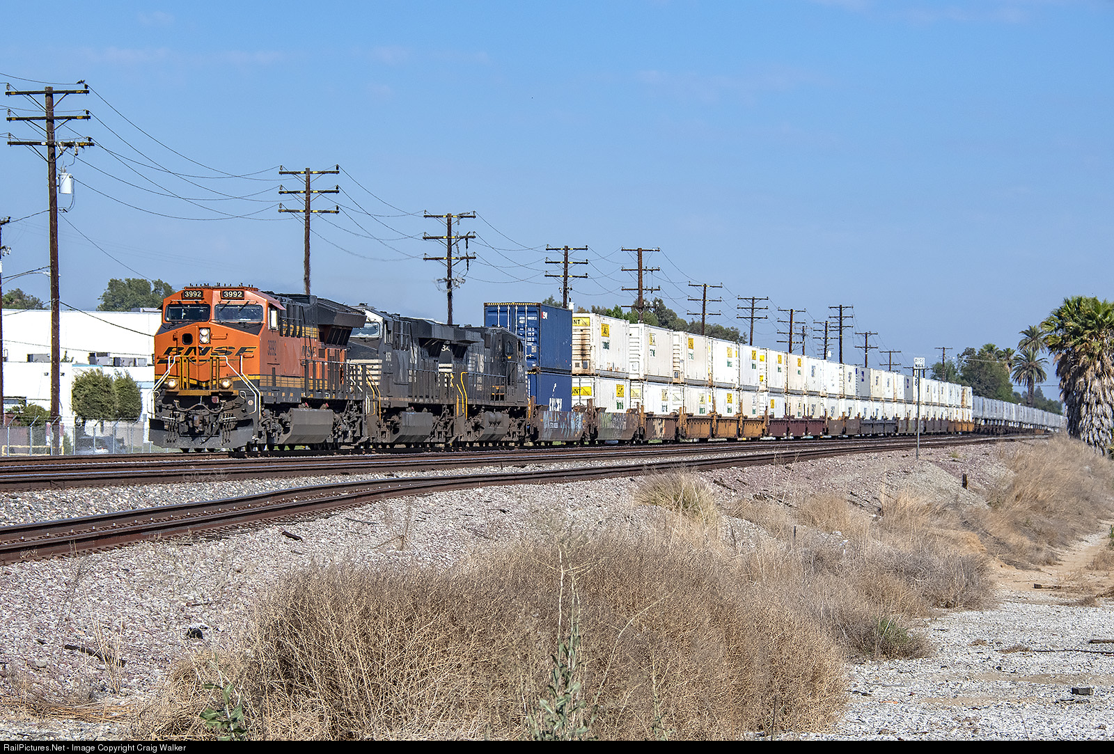 Twenty minutes behind a westbound with Kansas City Southern power on it, is BNSF train Q-NYCLAC6-29L (Guaranteed Service Intermodal; New York NY to Los Angeles CA) which, until it got to Barstow, had an all-Norfolk Southern set of power. BNSF must have determined that it should have one more to get over Cajon Pass and added BNSF ET44C4 3992 to assist NS ES44AC 8050 and NS Dash 9-40CW 9834. This was a disappointment, as solid sets of off-line power on the BNSF are not as common as having a home-road engine up front. This 81 car, 3693 ton, 7752-foot train is passing milepost 158 on BNSF’s San Bernardino Sub, so it has just 13 miles to go in its cross-country (cross-continent!) trip. (Santa Fe Springs, California – July 3, 2021)