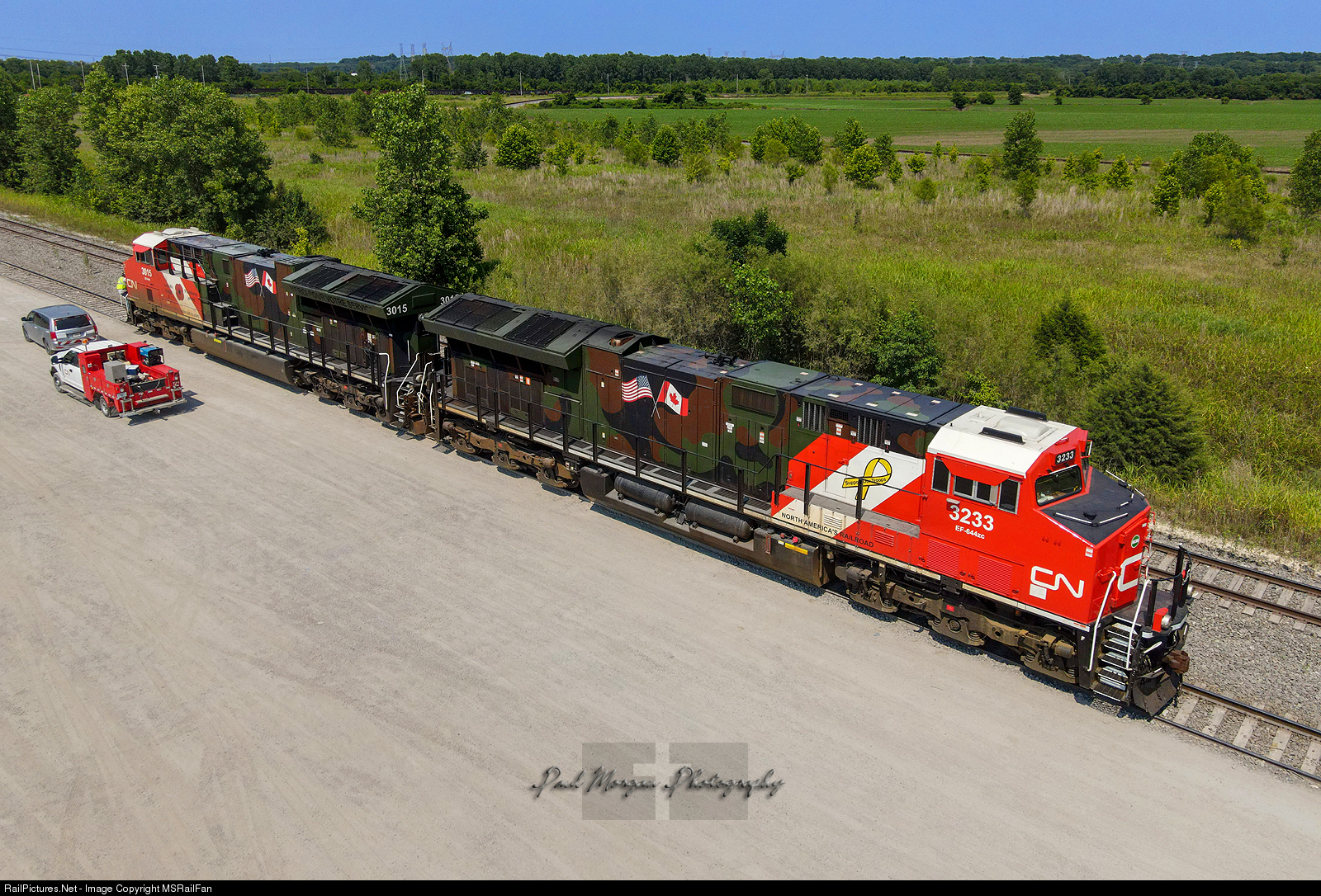 | It was indeed a Happy Independence Day! Canadian National Veterans Units 3015 and 3233 came into Memphis paired together on Z194 and left on Z195 - 3015 leading and 3233 as DPU. Here both units can be seen coupled together (first time I've seen both together) with the crew getting on board at the intermodal ramp. |